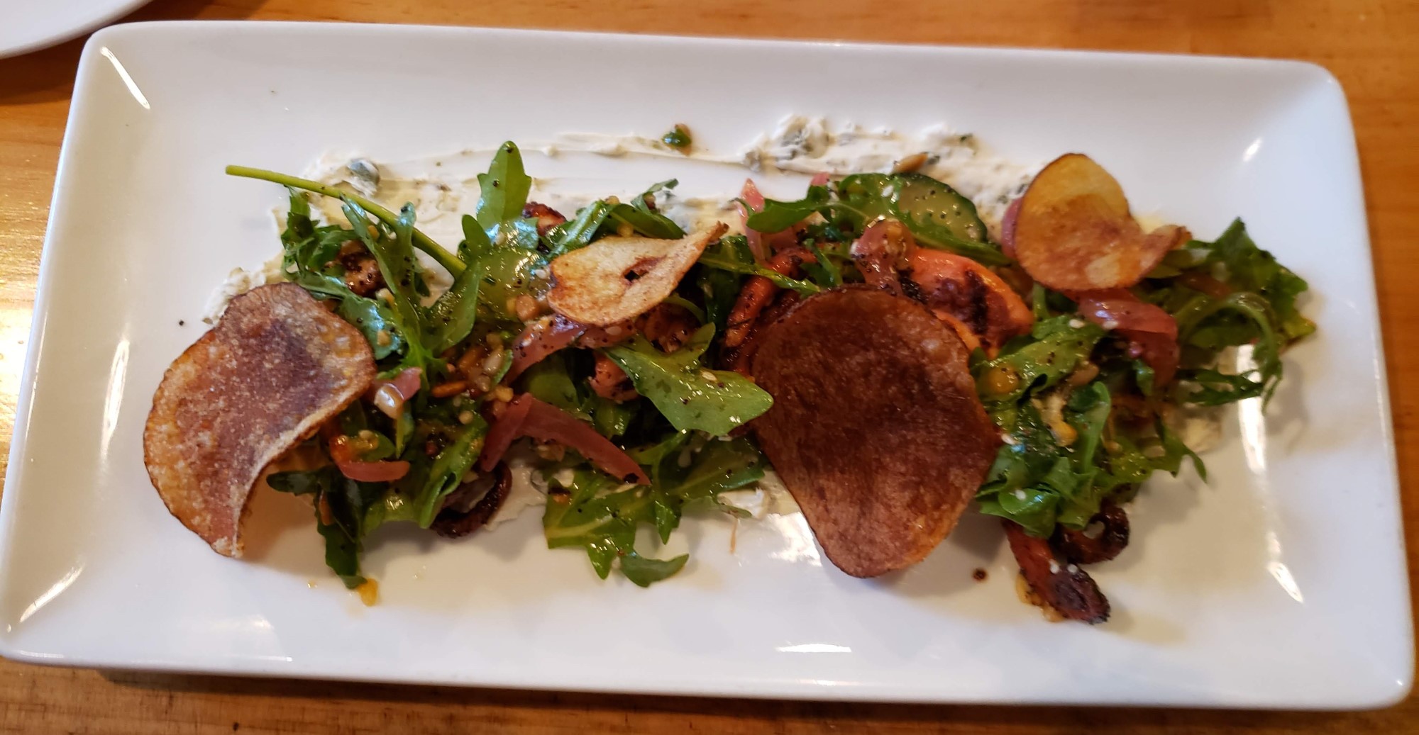 In my main course, the octopus is hard to see, but I promise there were generous amounts proportionate to the dish size, intertwined with capers, dill, everything seasoning, pickled red onions, marinated cucumbers, arugula and potato chips.