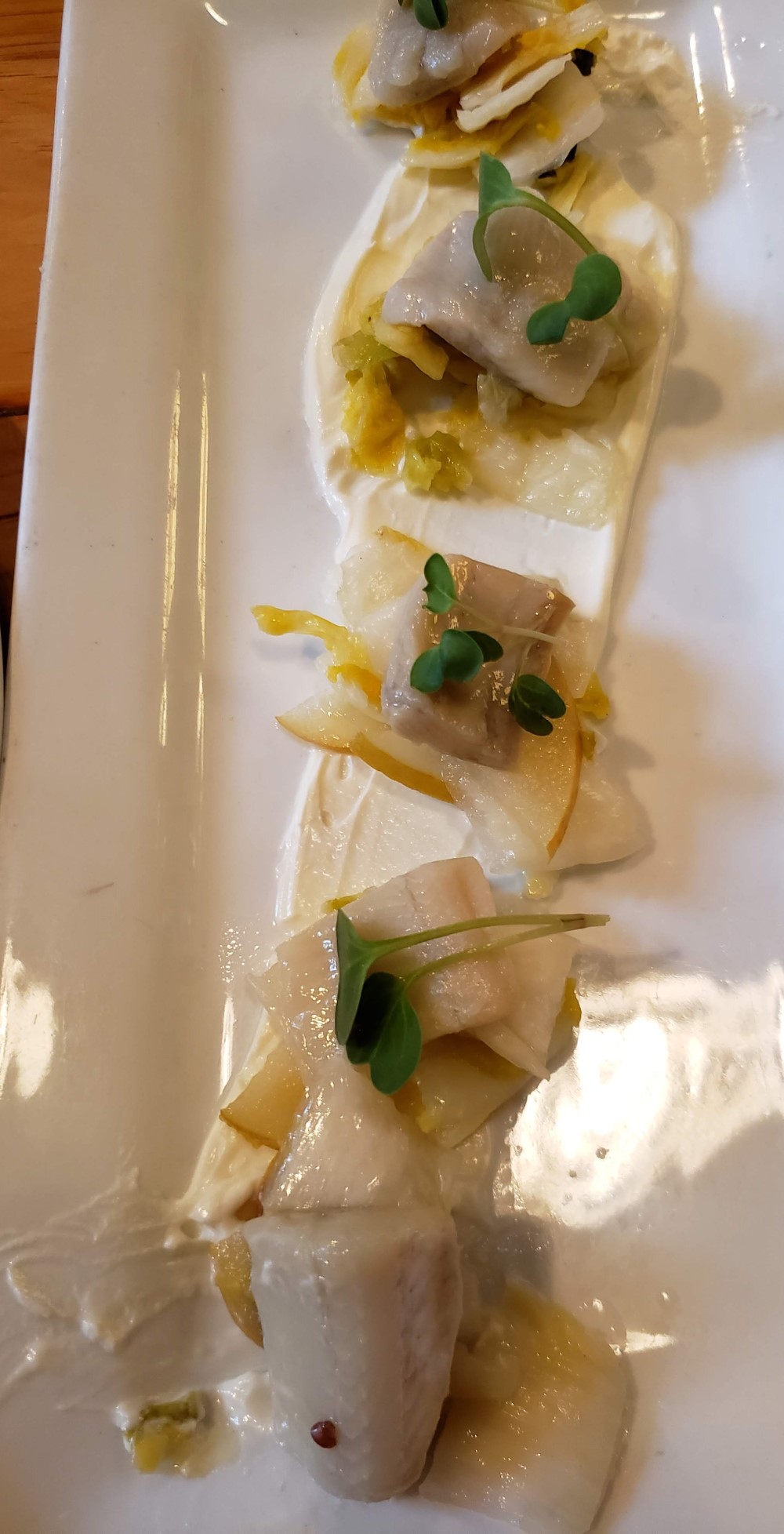 Pickled herring with white kimchi, pears, creme fraiche and onion. We’d never tried herring and Anne was relieved they aren’t remotely the same thing as anchovies.