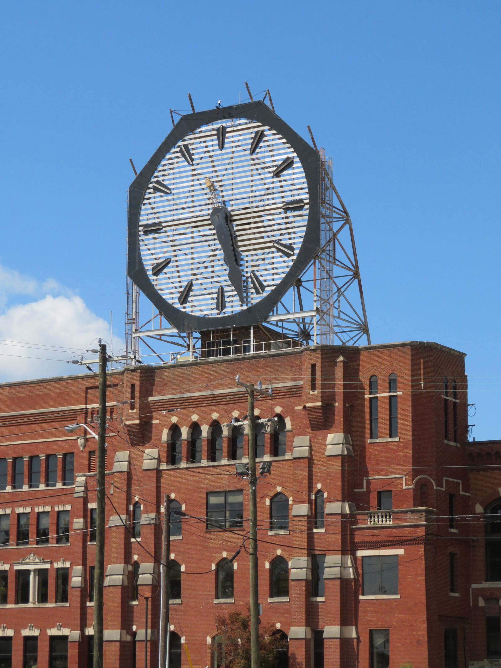 Until and unless someone makes the next move, the forty-foot-diameter timepiece remains on watch as one of The World’s Largest Clocks. We spotted its New Jersey brother — younger yet larger — on a previous road trip in 2010. Anne was excited to see this one closer up and complete the set.