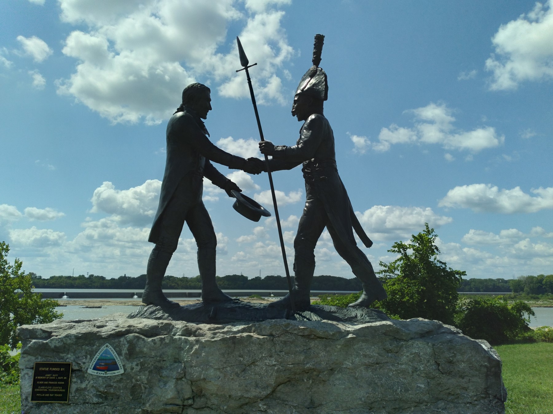 After dallying in Jeffersonville but before pushing on toward Louisville, we digressed a few miles west into Clarksville, where Falls of the Ohio State Park sits along the shore of the Ohio River and offers a scenic view of Kentucky on the far side. The park’s location was chosen for its significance to Indiana history, centered as it is around the former homestead of the explorer George Rogers Clark, whose name was a mandatory subject in Indiana fourth-grade social studies classes when we were kids. We touched upon his story in a previous summer vacation and dodged around the question of how his encounters and relations with the indigenous on his travels may not have aged well into the current era of ceaselessly rethought and re-rethought topicality. Nevertheless, Clark still has things named after him to this day.