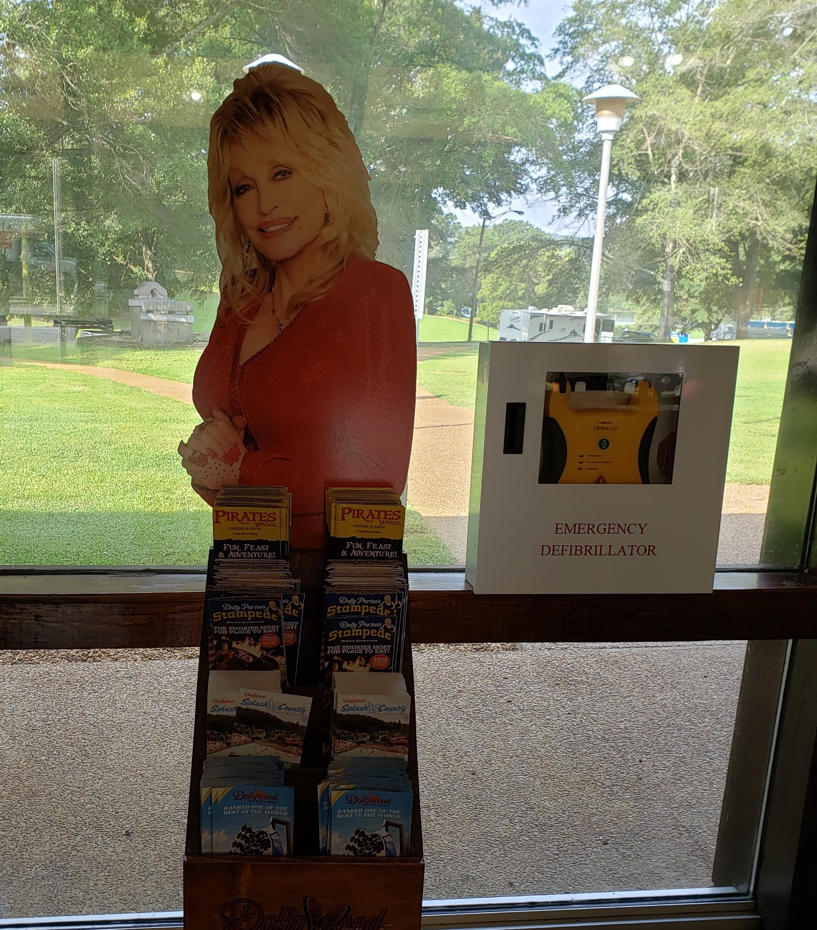 A Dolly Parton standee offers free travel brochures. For anyone who gets way too excited at the sight of her, lifesaving equipment is right nearby.
