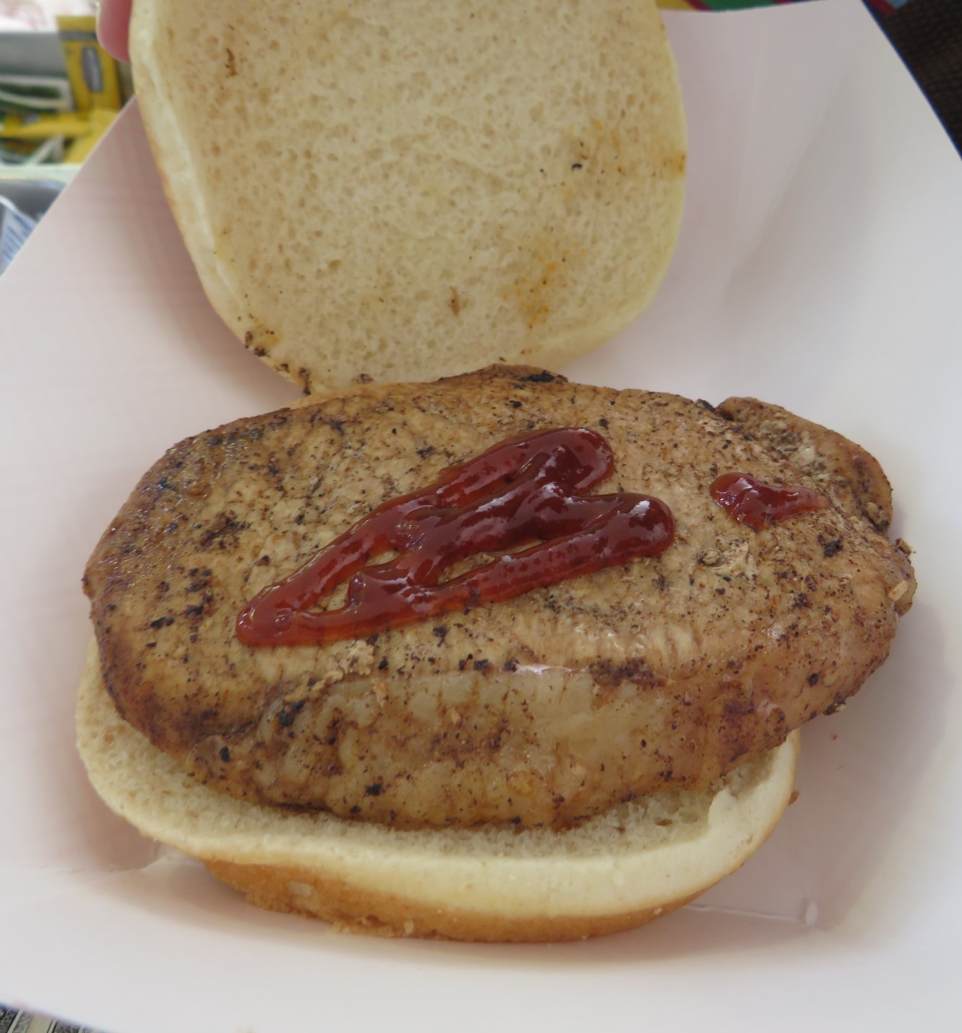 After a bit more nearby shopping, we took a free shuttle over to the north side, found the pickle pizza, then continued our trek on foot toward the northeast corner. By this time Anne needed some solid lunchtime protein and, once again like a norm, visited the Indiana Pork Producers tent for one of their classic staples, the boneless pork sandwich. They too offered a Taste of the Fair side dish, but far as we could tell, all they did was rename one of their Taste of the Fair dishes from a previous year.
