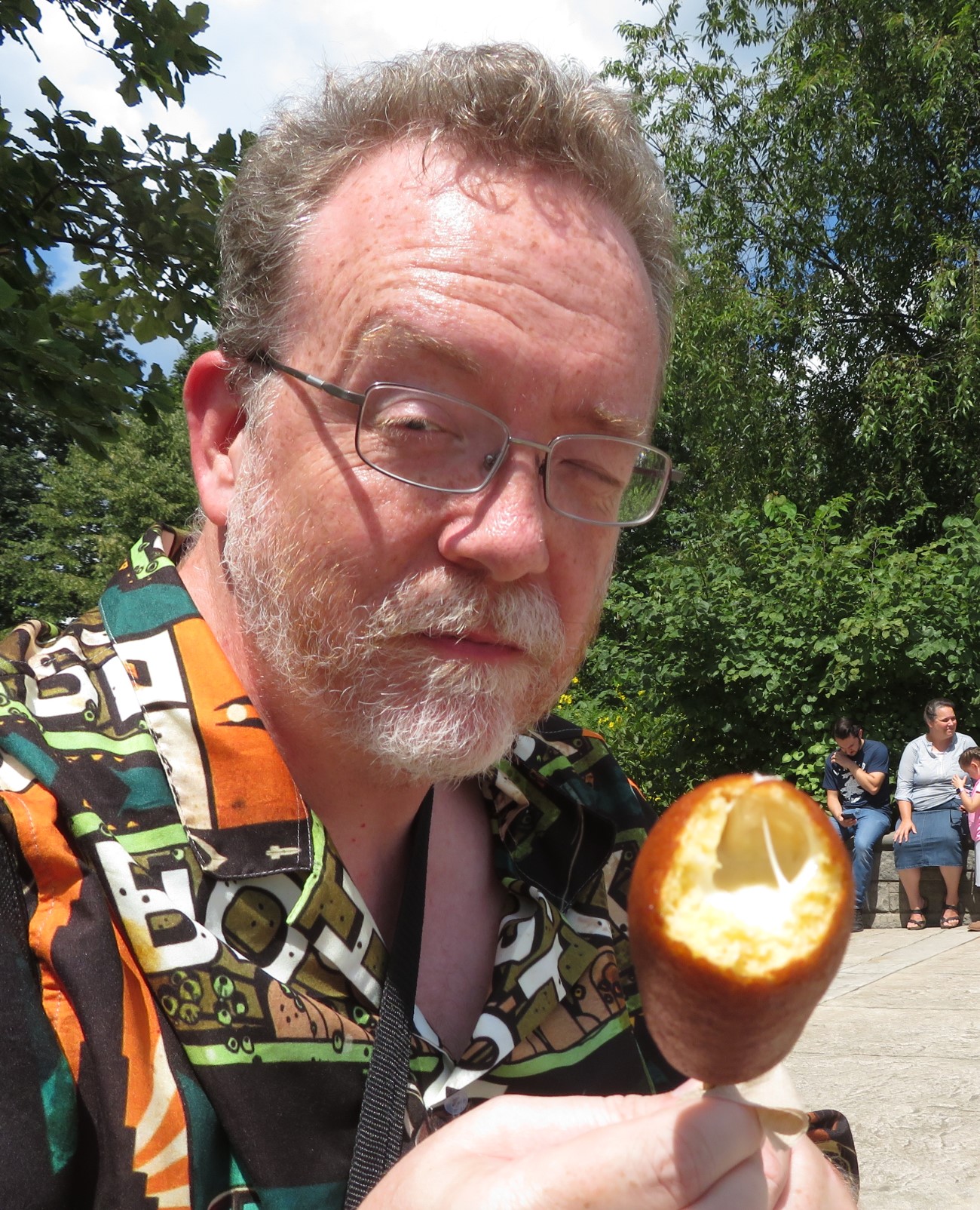 We retreated back to the west, and walked and walked and walked and eventually got back to the northwest corner of the fairgrounds, where some of the best stands gather. We stopped at one booth for two more Taste of the Fair contestants, starting with a Peach Shake-Up. Anne is big on fruity flavors and was curious to see this variation on Lemon Shake-Ups, that celebrated fair-food classic. The finished product wasn’t strongly peach-colored, but I can vouch for the flavor, which was authentically, pleasingly peach.