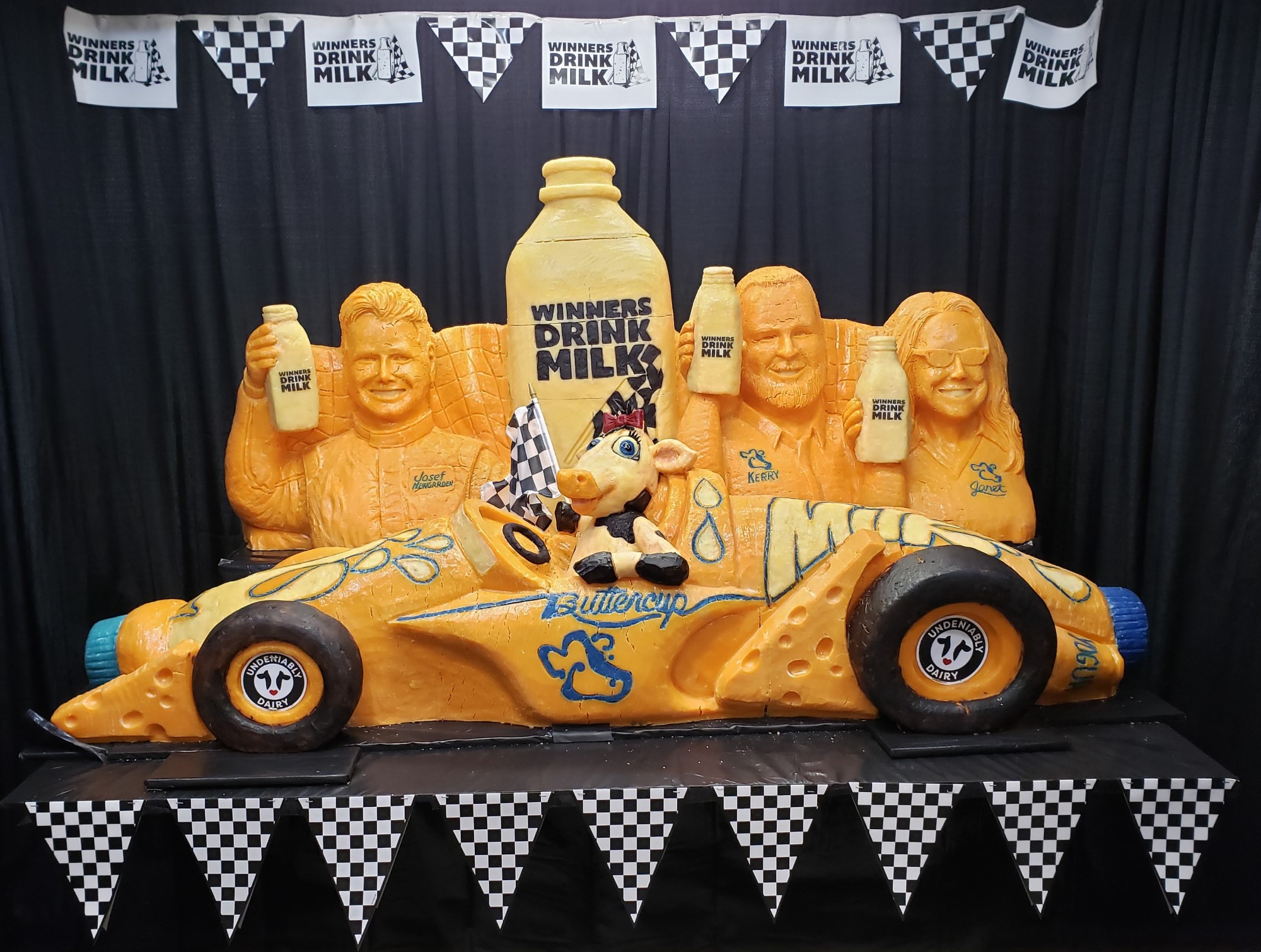 Carved left to right: frequent Indy 500 racer Josef Newgarden; the farmer who’ll be the official “milk presenter” at the end of next year’s Indy 500; and a board member who held that same role at the 2016 Indy 500. Cheese!