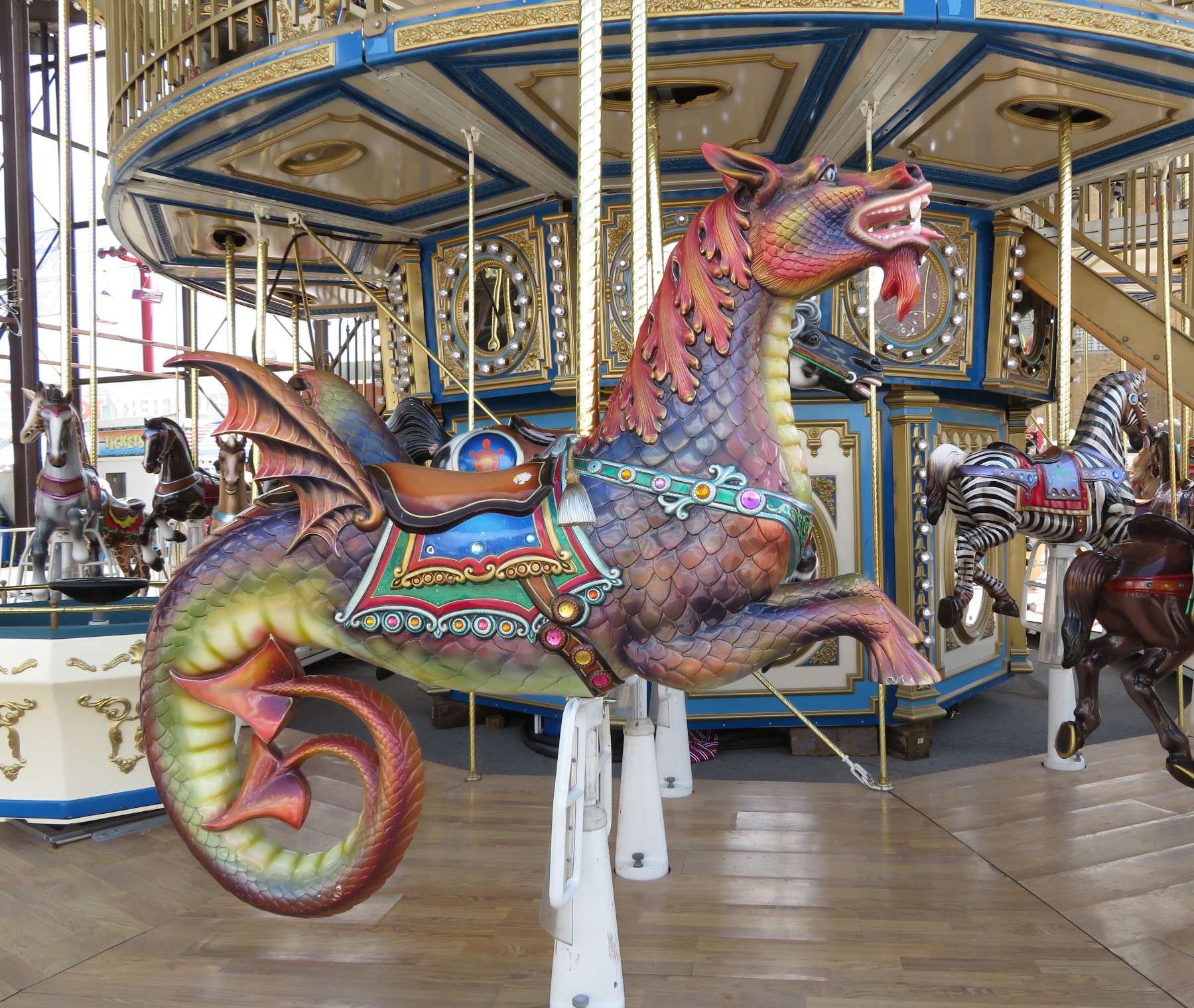 Near our exit stood the fair’s double-decker carousel, whose noble steeds include this hummingbird…