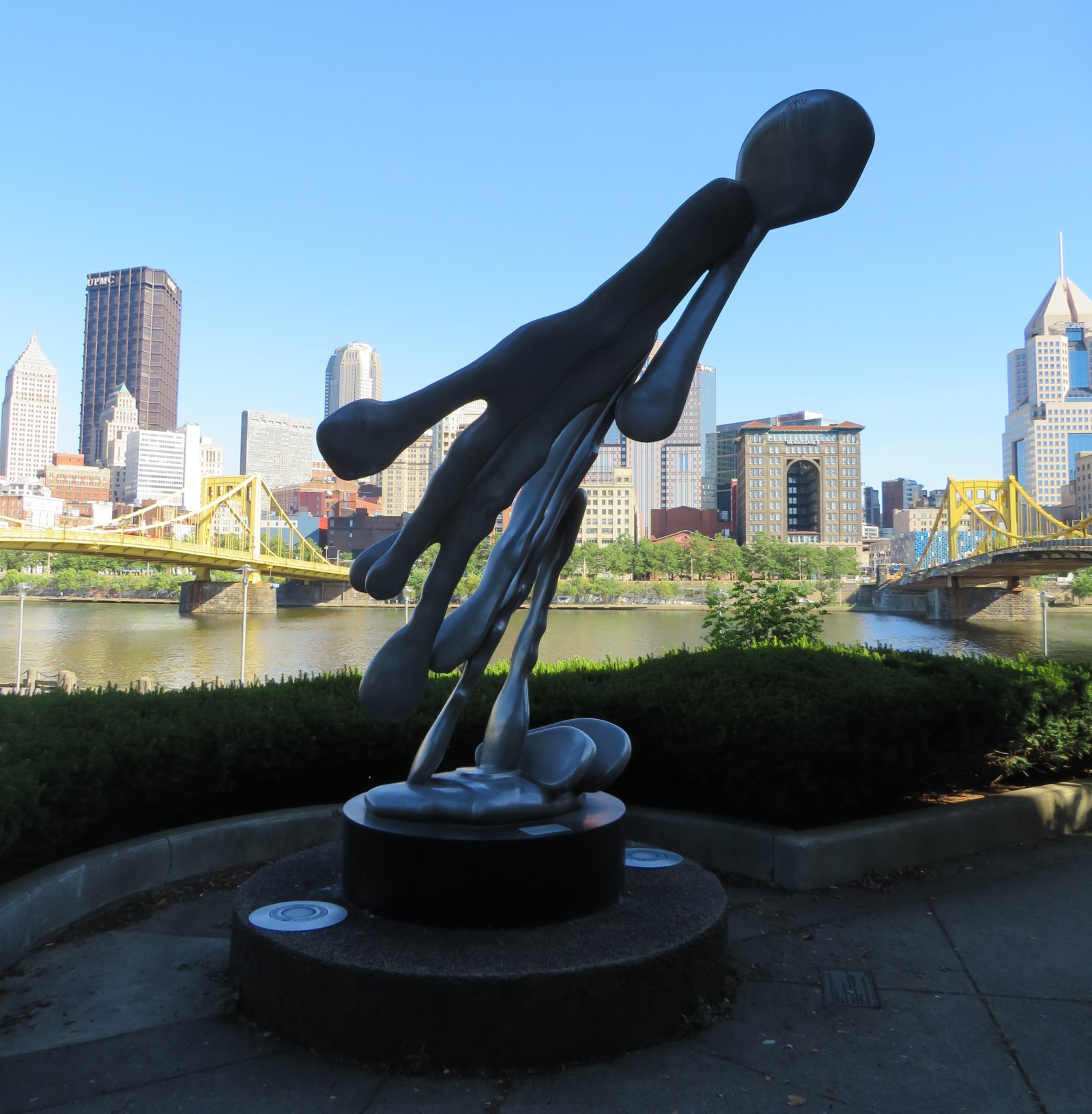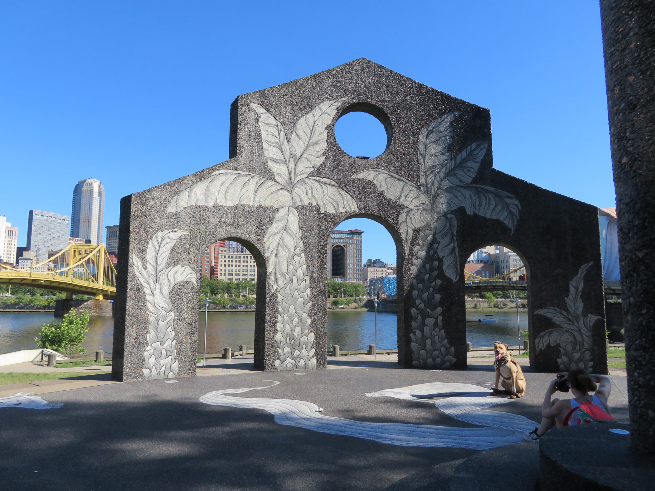 Wide public paths stretched all along the riverfront, where bicyclists and scooter users far outnumbered the joggers and the walkers like us, though no one group exactly abounded. We headed northeast away from the ballpark decor and toward Allegheny Landing, a value-added park bedecked with greenery and art.