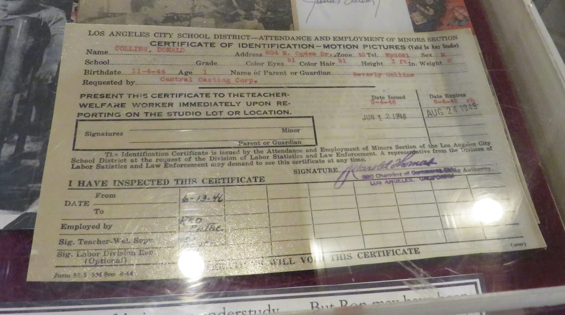 Lest we forget the fourth and oldest Bailey kid, here’s mandatory child actor paperwork for Donald Collins, one of the toddler twins who played Pete in a post-marriage scene and costarred in numerous Blondie films.