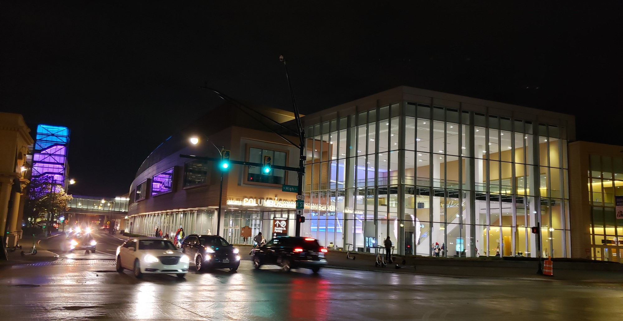 The northwest corner of the Convention Center at night. At far left, the blue-and-purple stack is the Goodale Street Garage where we parked the next morning.