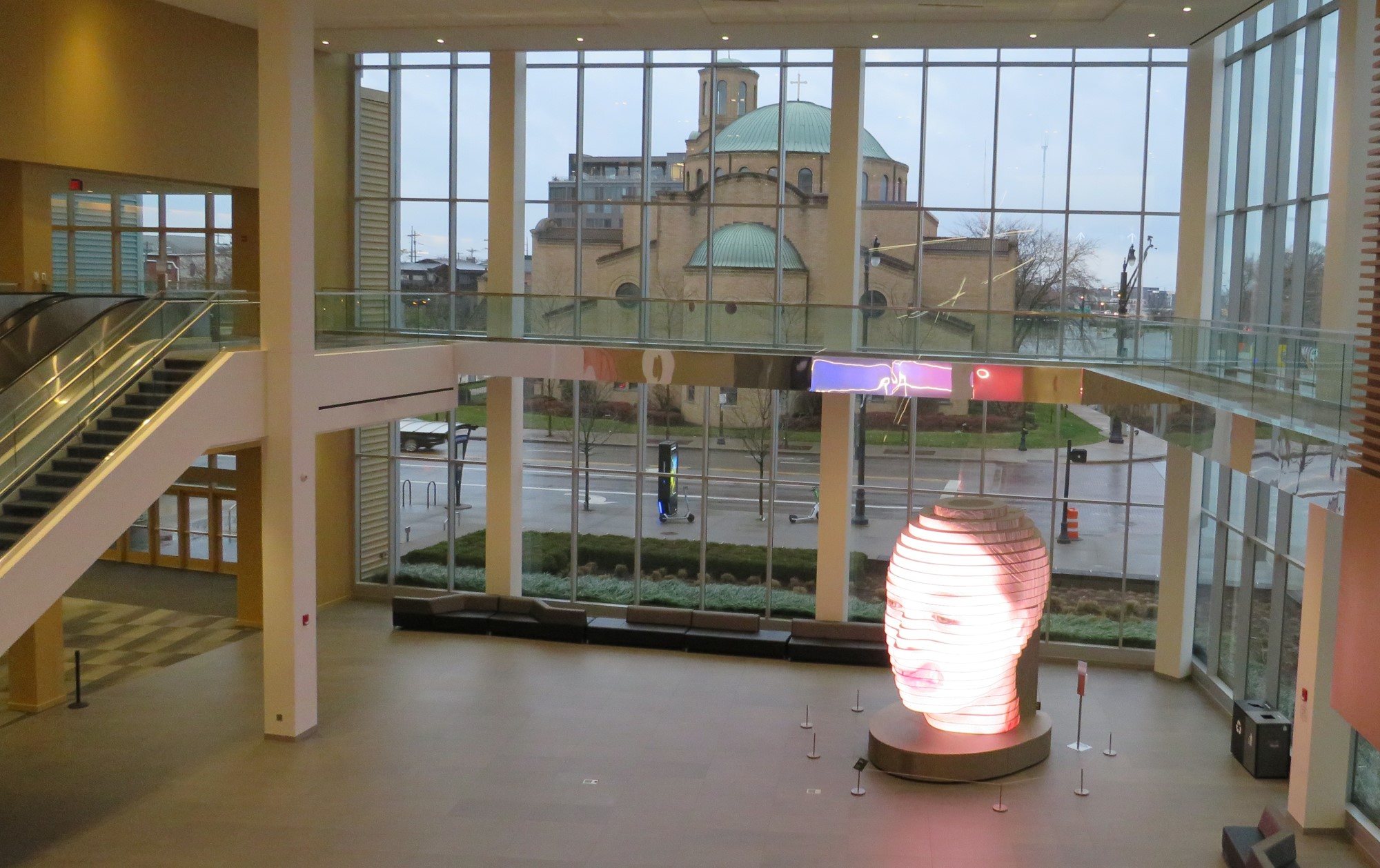 On the other side of High Street through the window is Annunciation Greek Orthodox Cathedral. In the Center’s lobby is Matthew Mohr’s 2017 installation As We Are, which blows head shots up to 14 feet tall.