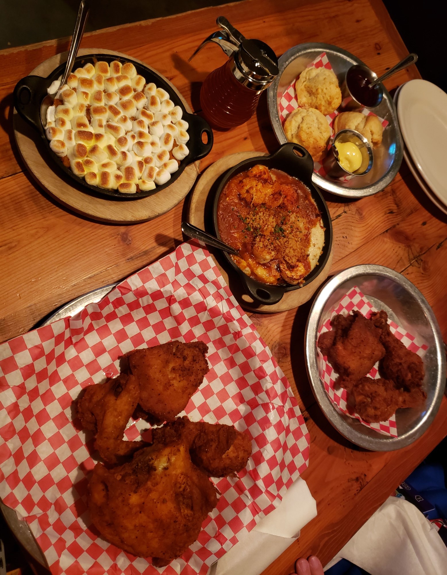 To go with the scrumptious house-brined chicken (served with spicy honey), our sides were a sweet potato crock with toasted marshmallows, shrimp & grits, and biscuits with honey butter and blackberry jam.