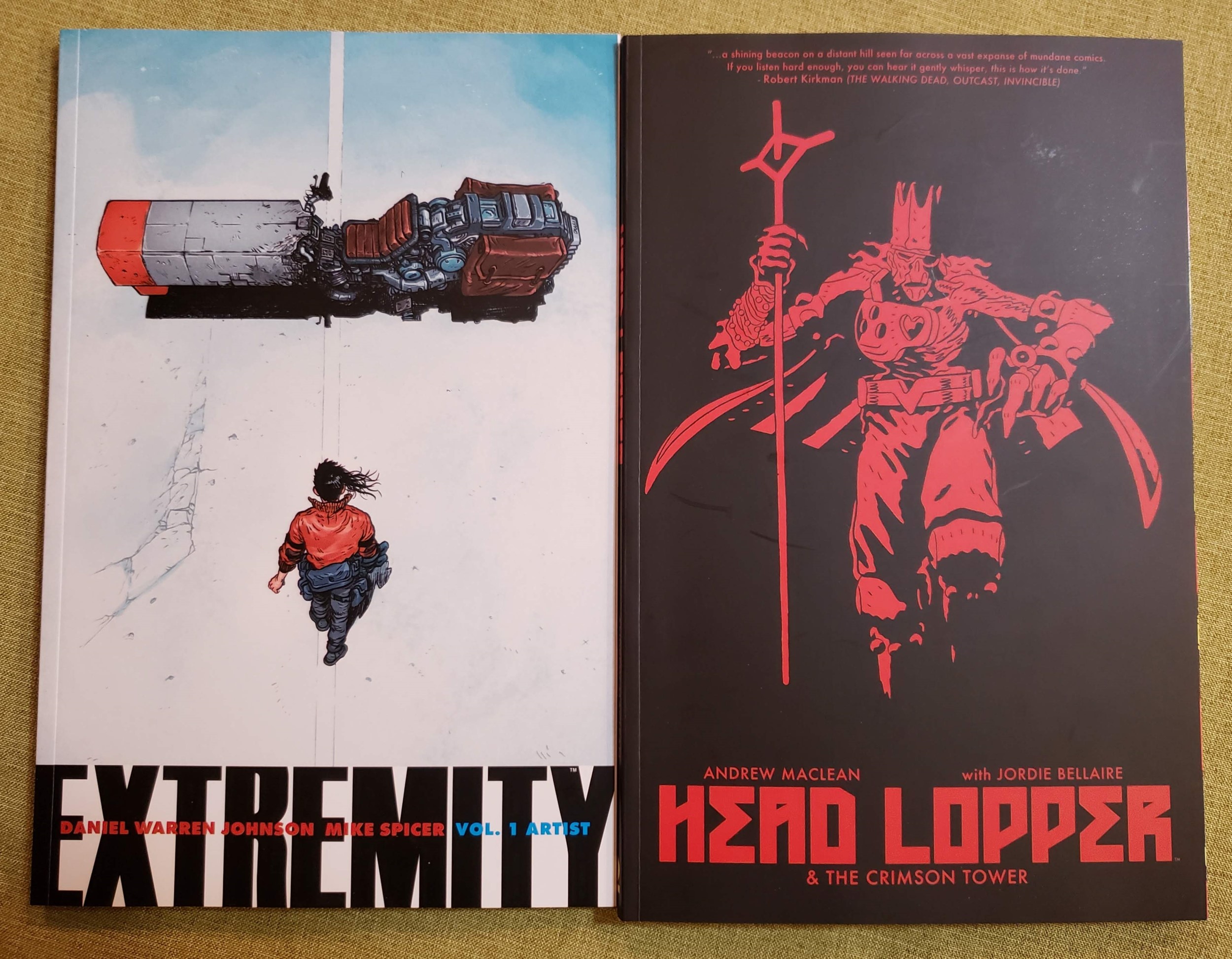 23. Daniel Warren Johnson and Mike Spicer, Extremity, Vol. 1: Artist (2017). In a future world where one clan has ravaged another, the leader vows payback by any means necessary and insists that his daughter Thea must also fight and commit wartime atrocities by his side as revenge. Thea is a teenage artist whose drawing hand was amputated and is struggling to train her weaker hand to take over, with mixed results. And it’s hard to make time for practice when you have to be on the warpath all the time. The back cover describes this as “Studio Ghibli meets the intensity of Mad Max“, which is so apt that I’m at a loss to write a high-concept comparison in my own words, although you cannot look at that cover without recognizing the Akira influence. The powerfully orchestrated carnage is real and pervasive, and Thea’s inner struggle — especially when contrasted in arguments with her more pacifistic brother — comes from a giant-sized, aching heart that you normally can’t hear beating in over-the-top action comics like this one. I’m definitely on board for more.