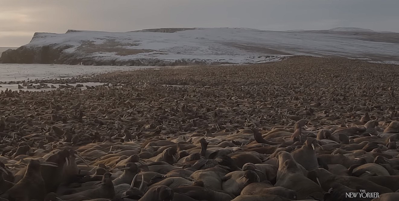 Haulout (The New Yorker): A Siberian researcher whiles away the days in his meager shack through an endless string of gray days until the day comes when his subjects arrive for study. The camera stumbles around in a dark corner until he opens the door and, lo and behold, what’s come a-knockin’ are ONE HUNDRED THOUSAND FRICKIN’ WALRUSES mooing and bumping and writhing all around the place. ONE HUNDRED THOUSAND OF THEM. THEY COUNTED THEM. WITH WALRUSOLOGICAL HEAD COUNTERS. In Earth’s better days they had plenty of lands to choose from when it was time for the landlubber segment of their annual mating rituals, but fewer icebergs and fewer lands above water available to them in recent times means they have to converge on the fewer refuges available. You can be all “LOL climate change believers suck” if you want, but ONE HUNDRED THOUSAND FRICKIN’ WALRUSES are not all showing up in the same spot just because someone’s throwing a walrus comic-con and they invited Wally Walrus to sign autographs and plug a Woody Woodpecker reboot.
