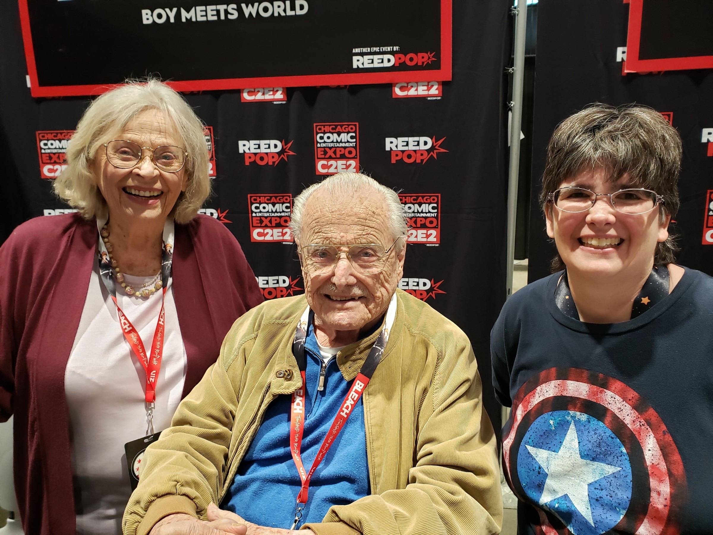 We don’t ask every celeb to do jazz hands. Some macho actors out there won’t countenance such a display of vulnerability. Some have a certain image to maintain. And one of our rules of thumb we’ve adopted over the years is we don’t ask elderly actors to do jazz hands. We’re happy to meet them and leave it at that — keeping it simple in a different way. That was the case Saturday morning as Anne met Bonnie Bartlett and William Daniels, who’ve been married for 71 years (maybe 72 — I don’t know their anniversary). The two of them were regulars on St. Elsewhere and worked together when she recurred on Boy Meets World, where Daniels became known worldwide to Generation Y as teacher-turned-principal Mr. Feeny. They were here for the con’s big Boy Meets World cast reunion, one of several being held at various U.S. cons of late.