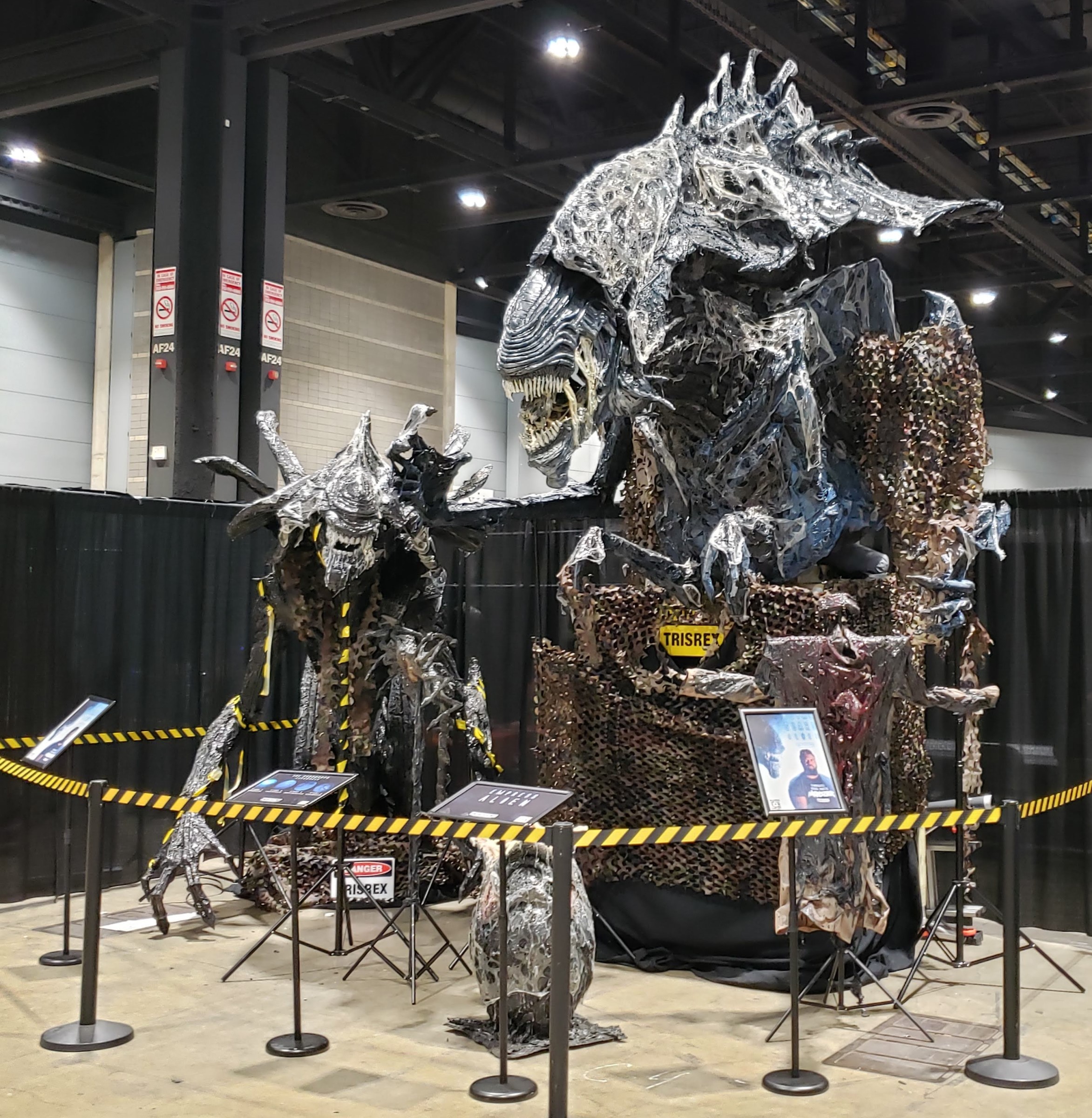 One ribbon-cutting later (obscured from our view behind a load-bearing column), our line section was permitted inside a few minutes after 10, and the game was afoot. All around the exhibit hall, the aisles were festooned with oversized creatures and creatively sculptedm beloved characters from every corner of pop culture. Some aisles were much wider than they’d been in years past. Some specially designated areas were given far more square footage than they’d had in previous incarnations. According to my mental math, while there was still a lot to see and absorb, all told there were far fewer vendors than there used to be. Artists Alley definitely had fewer rows than usual.