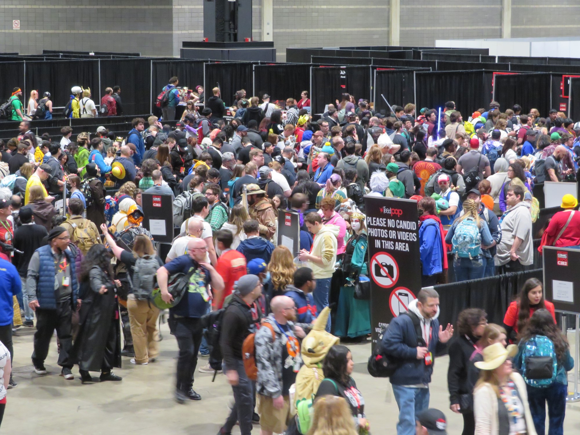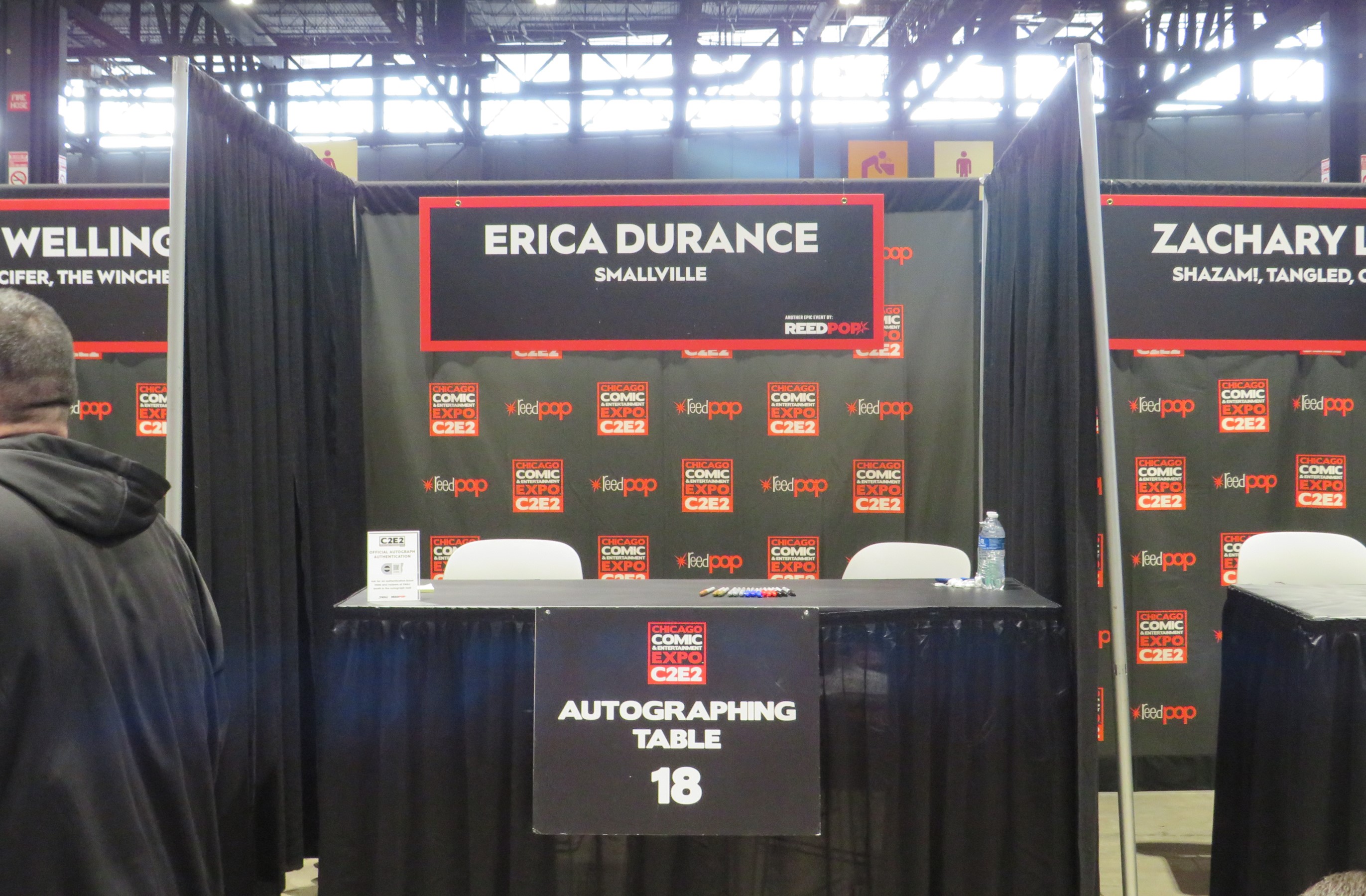…but most of our Friday alternated between walking and standing in lines, S.O.P. for our large-scale entertainment cons. Our first destination was the autograph line for Smallville’s Erica Durance, a scheduled guest from several past cons who kept canceling every single time. If Anne were ever to fill that gap in her Superman-actor autograph collection, Durance had to be top priority…assuming she showed up. And was real. A Facebook post from a Chicago morning show confirmed she was in town. We took hope from this evidence, and kept waiting and waiting and waiting.