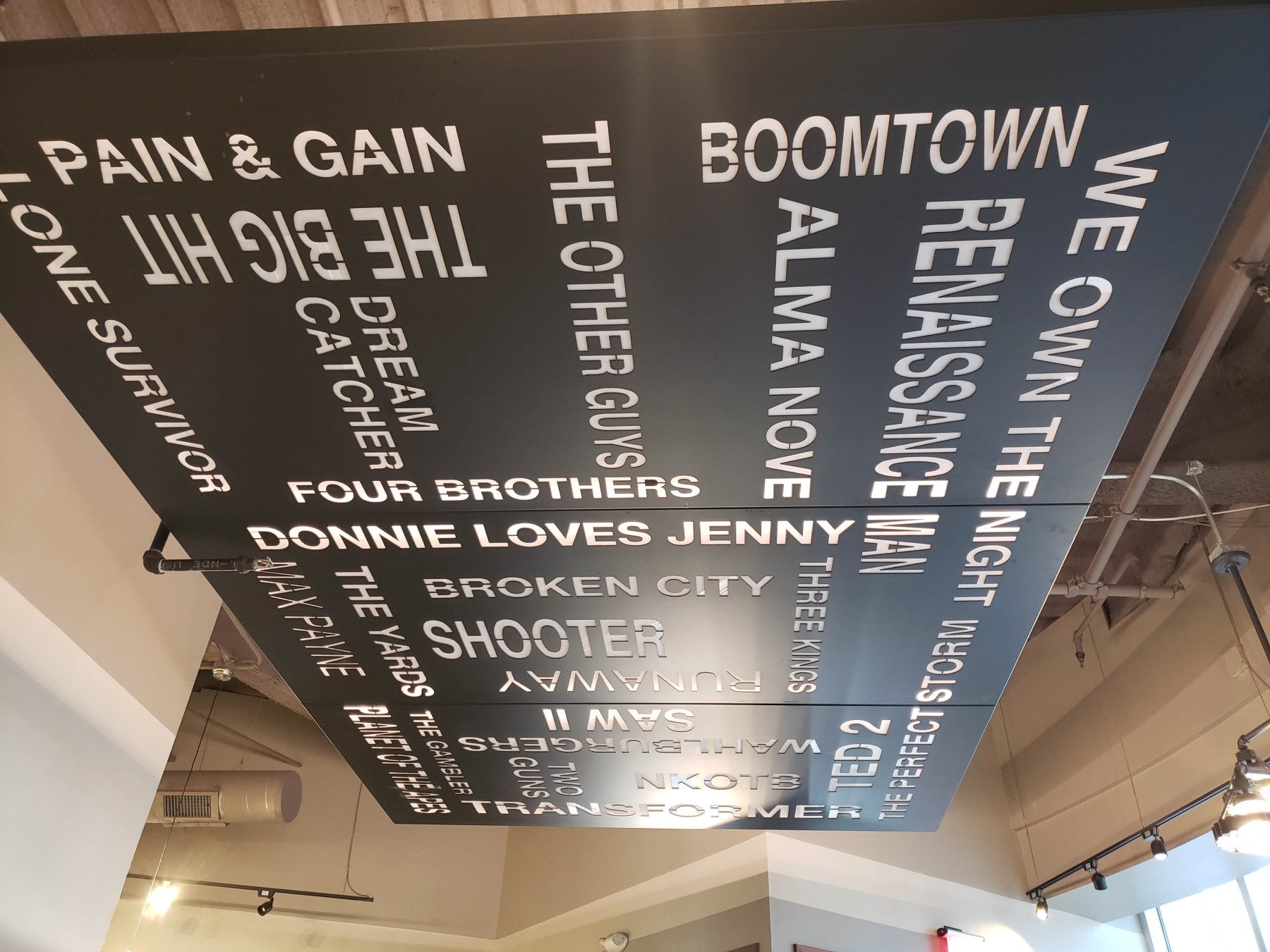 Hanging from the ceiling is a horizontal metal board listing numerous movies and TV shows with at least one Wahlberg in them.