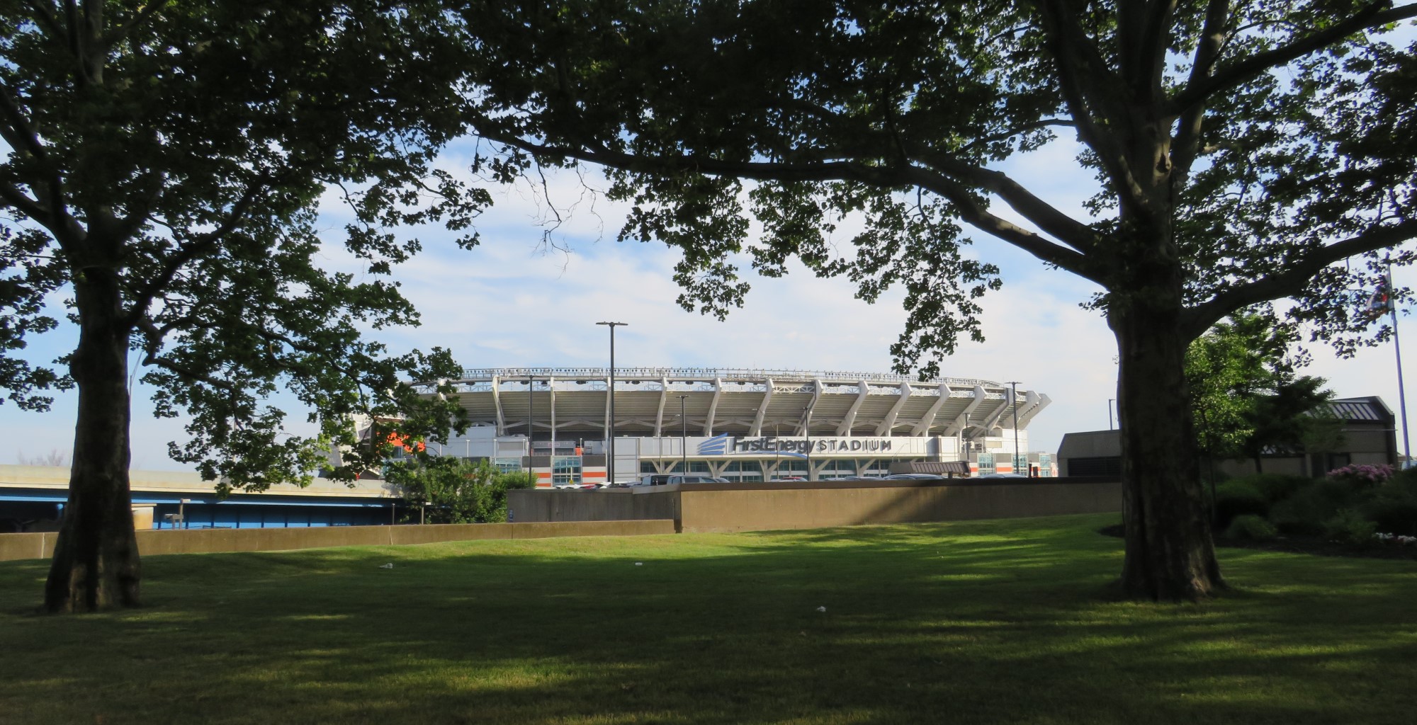 FirstEnergy Stadium, viewed through a pair of trees.