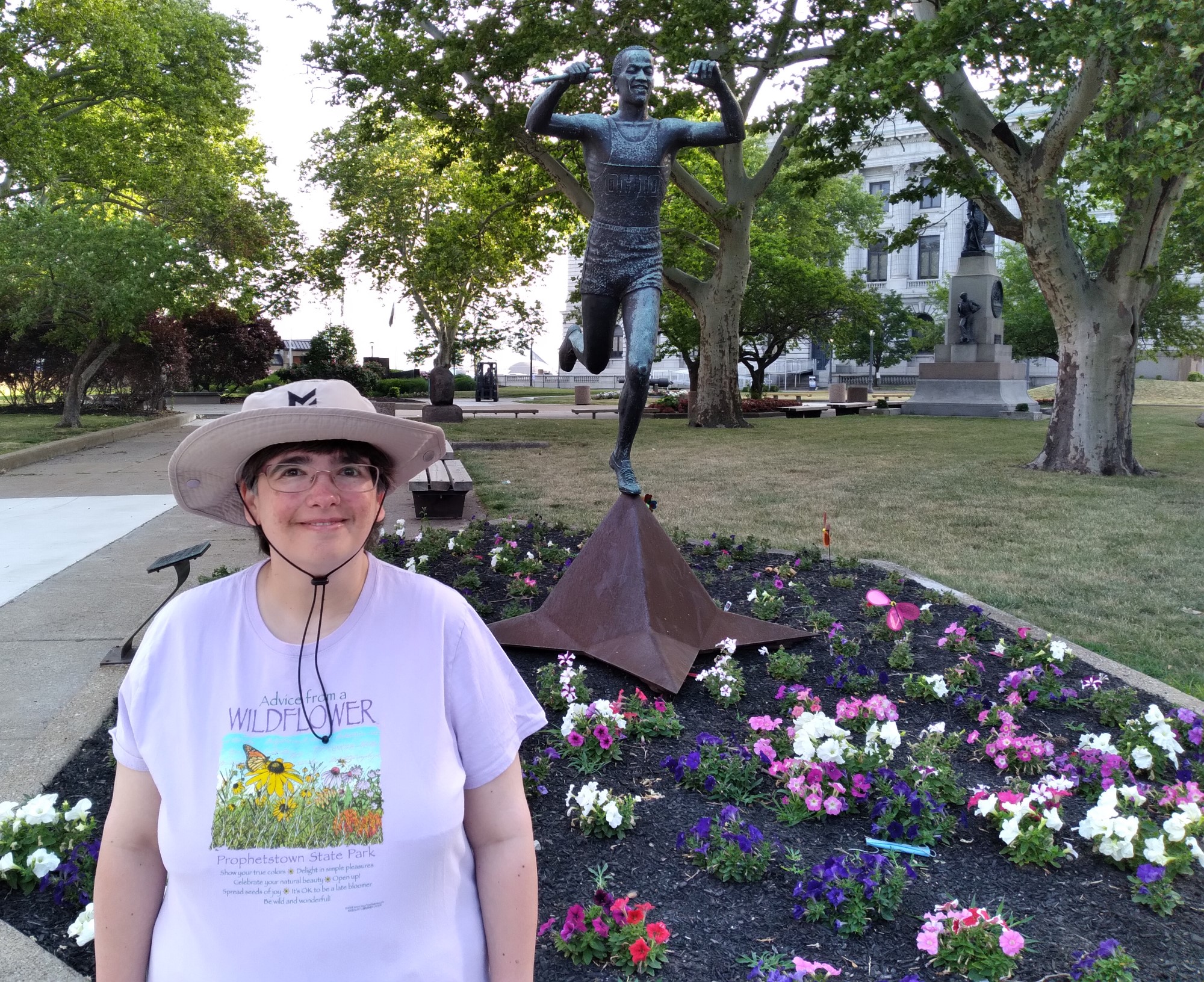 Anne smiling next to the Jesse Owens statue and a bed of pretty flowers.