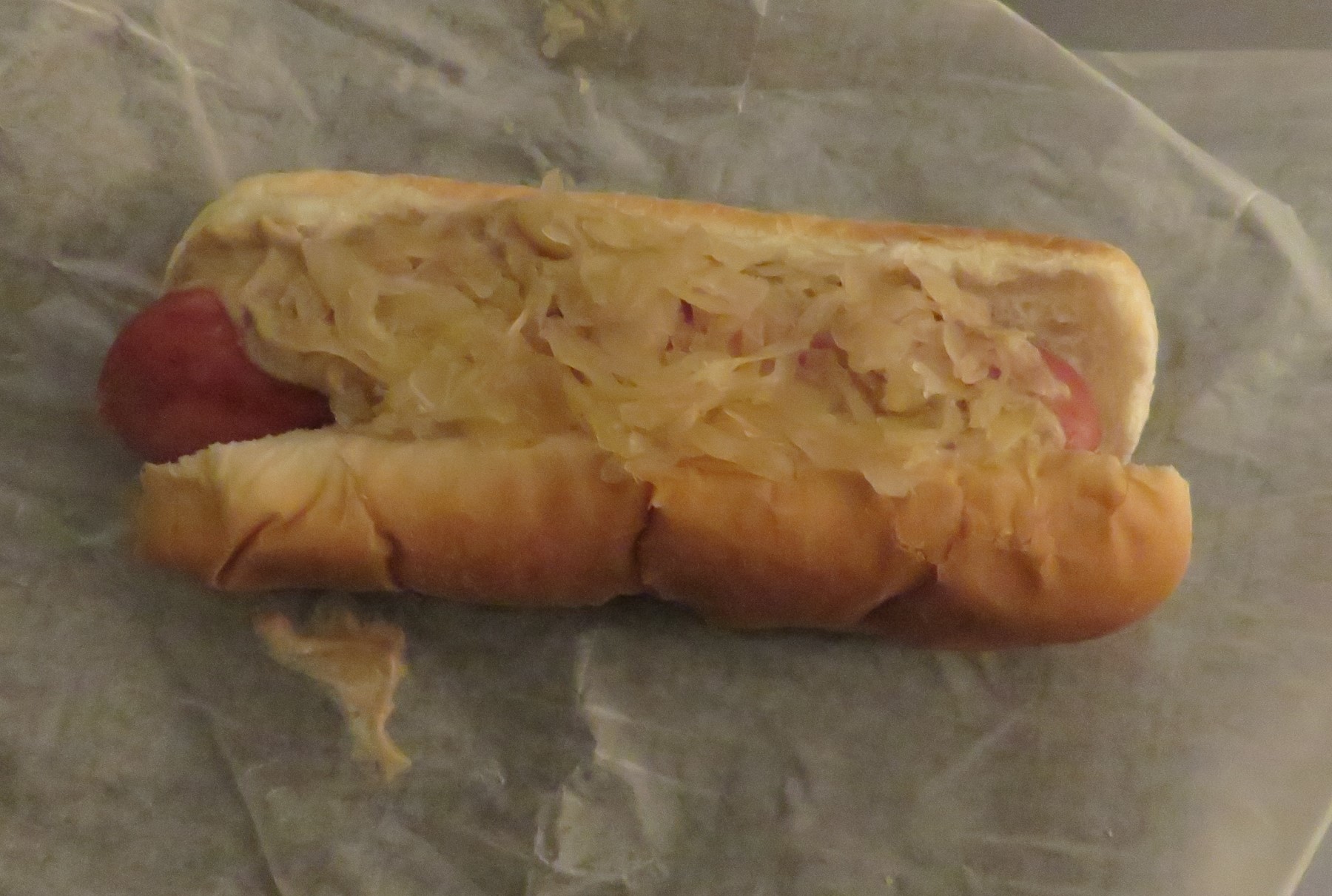 A brat in a bun with sauerkraut.