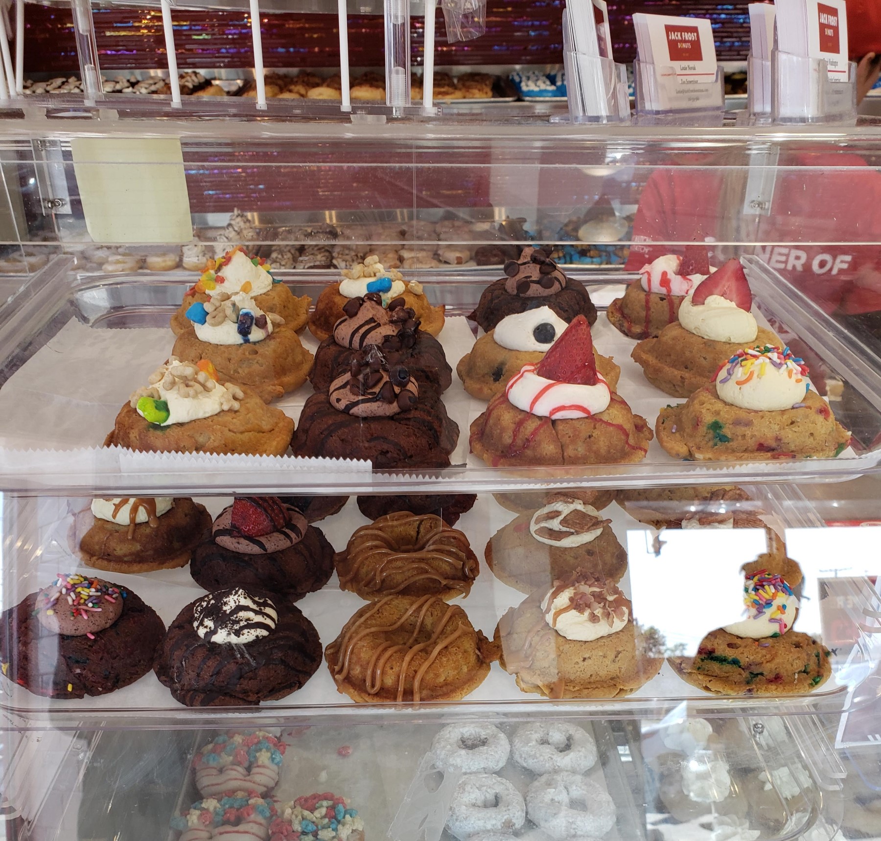 The front of Jack Frost Donuts, red and white.