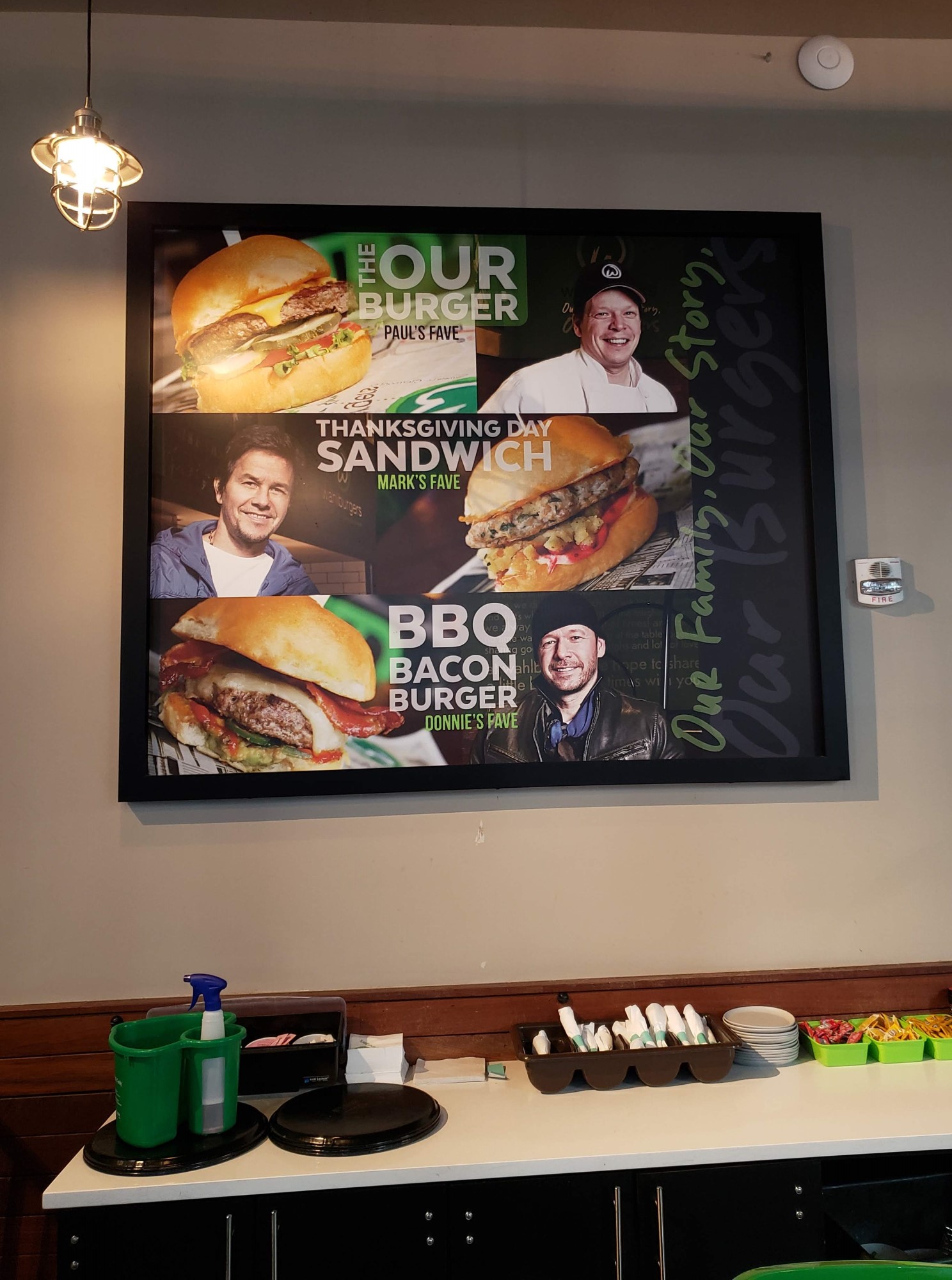 Hanging overhead is a reminder of various movies and TV shows with at least one Wahlberg in them.