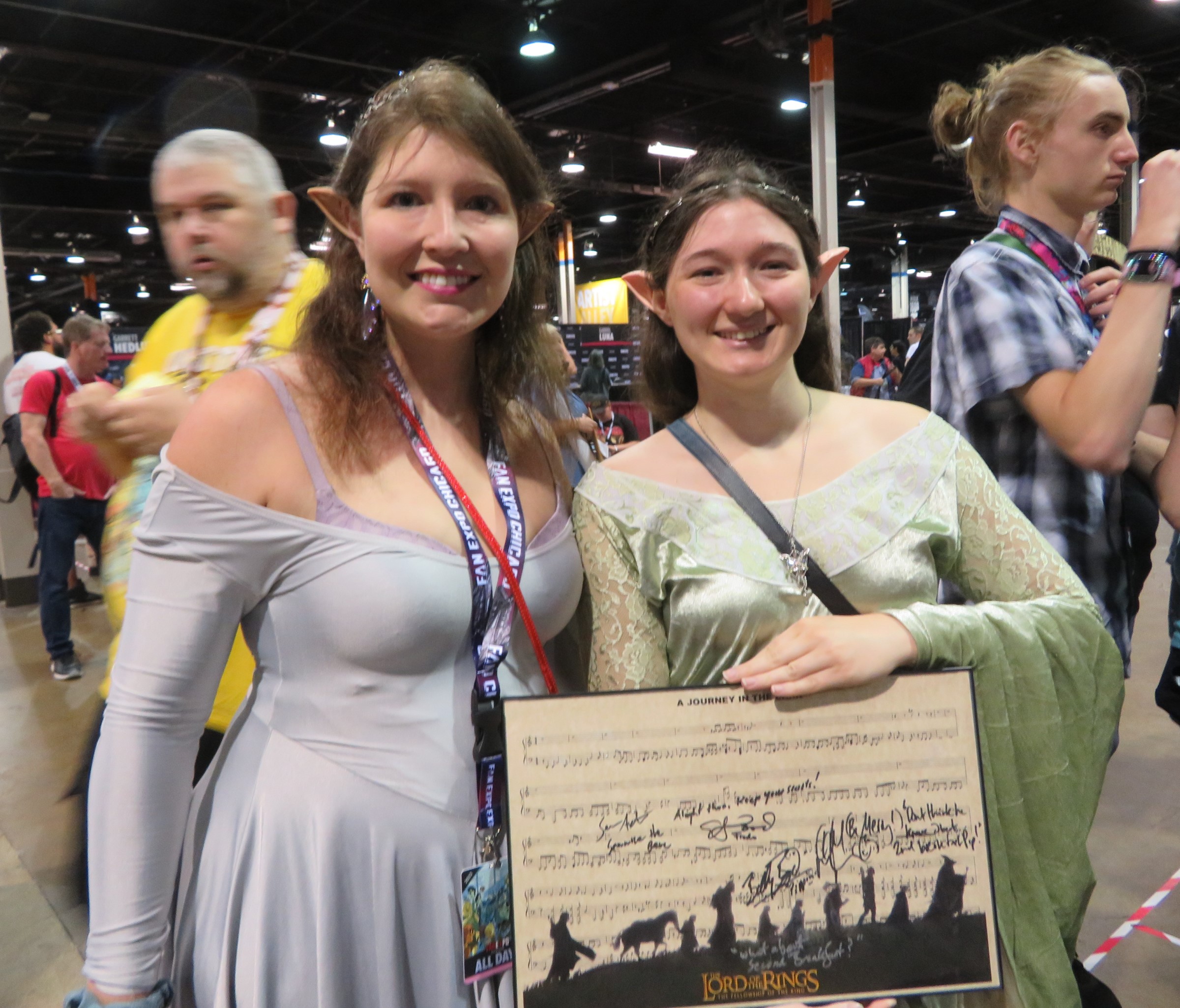 Two of our Sunday morning autograph line compatriots: Clover the Fairy (whose cosplay work is on Instagram and on Facebook) and Arwen holding some nifty, autographed sheet-music art.