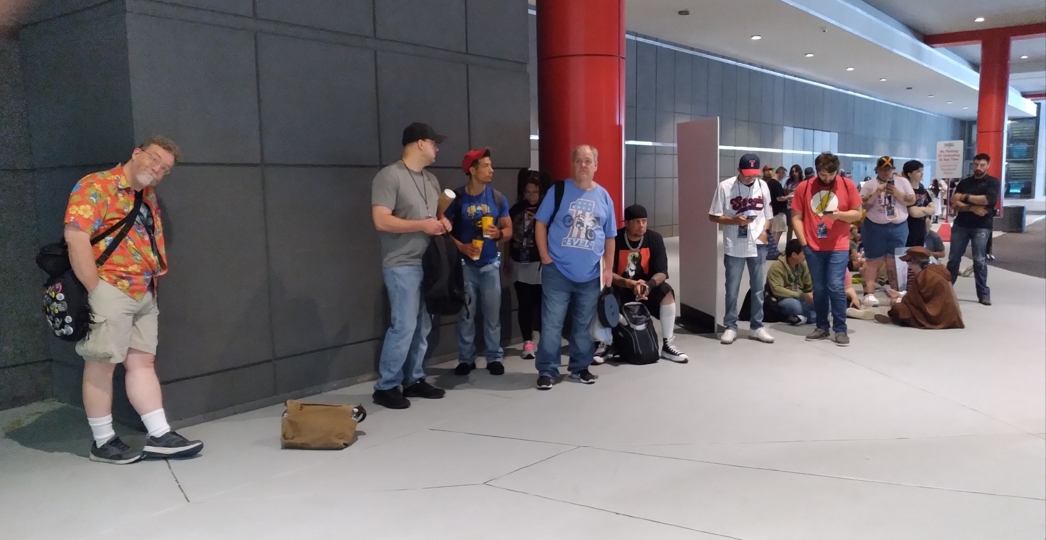 Saturday morning we arrived at 7:30 and took the Skybridge from the parking garage, across River Road and into the convention center. We were stopped short at the entrance to Hall F, where the indoor gamut would commence. There was no line inside yet and F’s lights were out. The security guard on duty looked puzzled and told us the show didn’t open till 10. We told him what we were used to. He didn’t complain as we sidled up to the nearest column, sat down and waited. Ten minutes later, a high-ranking official came up to us, whom I’m 98% sure was the same stentorian young lady who heroically took charge of last year’s photo-op mess and canceled that teeming apocalypse, and had to inform us fans weren’t allowed inside yet. We hadn’t realized our entry, free of obstacles and without a single locked door in our way, had amounted to a Leverage-style security penetration test.