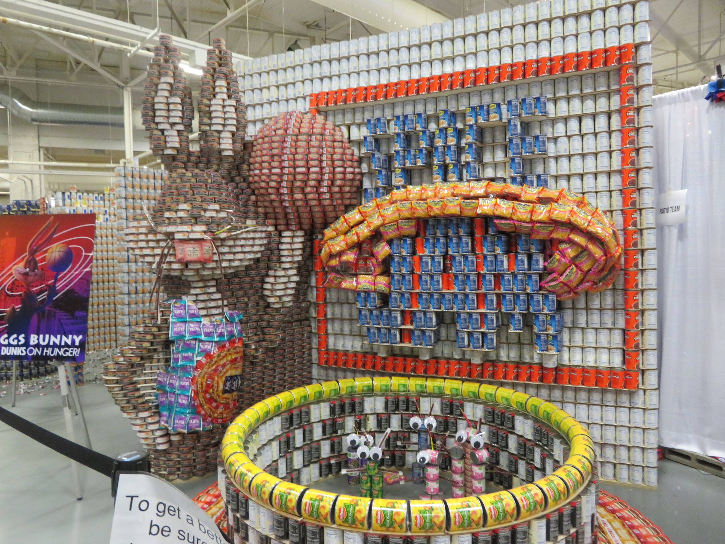 Yet another AgHort tradition is the Canstruction contest. Its namesake is a charitable organization that holds nationwide events in which engineers and other clever planners compete against each other in building the best sculpture made entirely from canned goods, preferably in recognizable shapes and not ordinary stacks with boring titles like “Clearance Sale on Aisle 5”. After the judging and the public displaying are over, all those meticulously planned figures are torn down and the components are donated to local hunger relief charities, who in turn forward them to needy families totally unaware their next few meals used to be Art.
