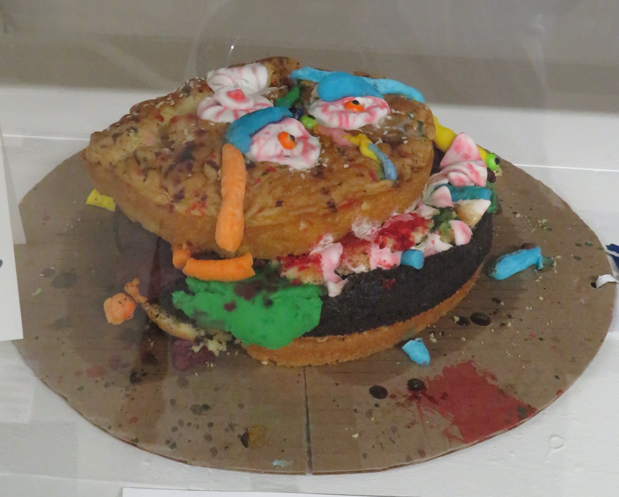 An audaciously focused Ugly Cake Contest awarded first prize to this sweet treat shaped like a Man v. Food burger.