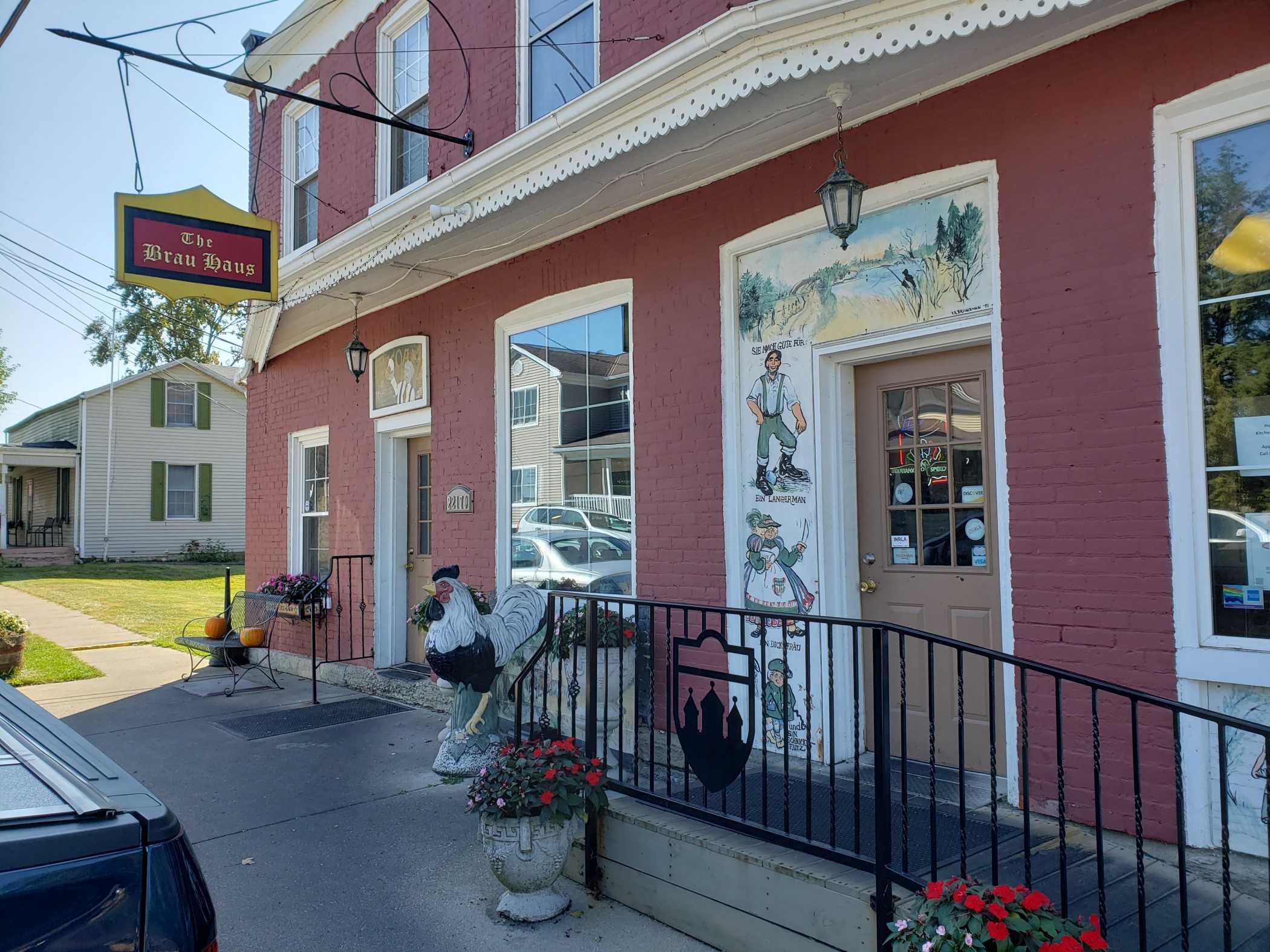 Angled view of the front of a brick restaurant with a red-and-yellow THE BRAU HAUS sign hanging on a pole bracketed on the wall. Decor includes a black iron fence with a silhouetted crest of spires, German Oktoberfest celebrants painted around the door, and a chicken statue.