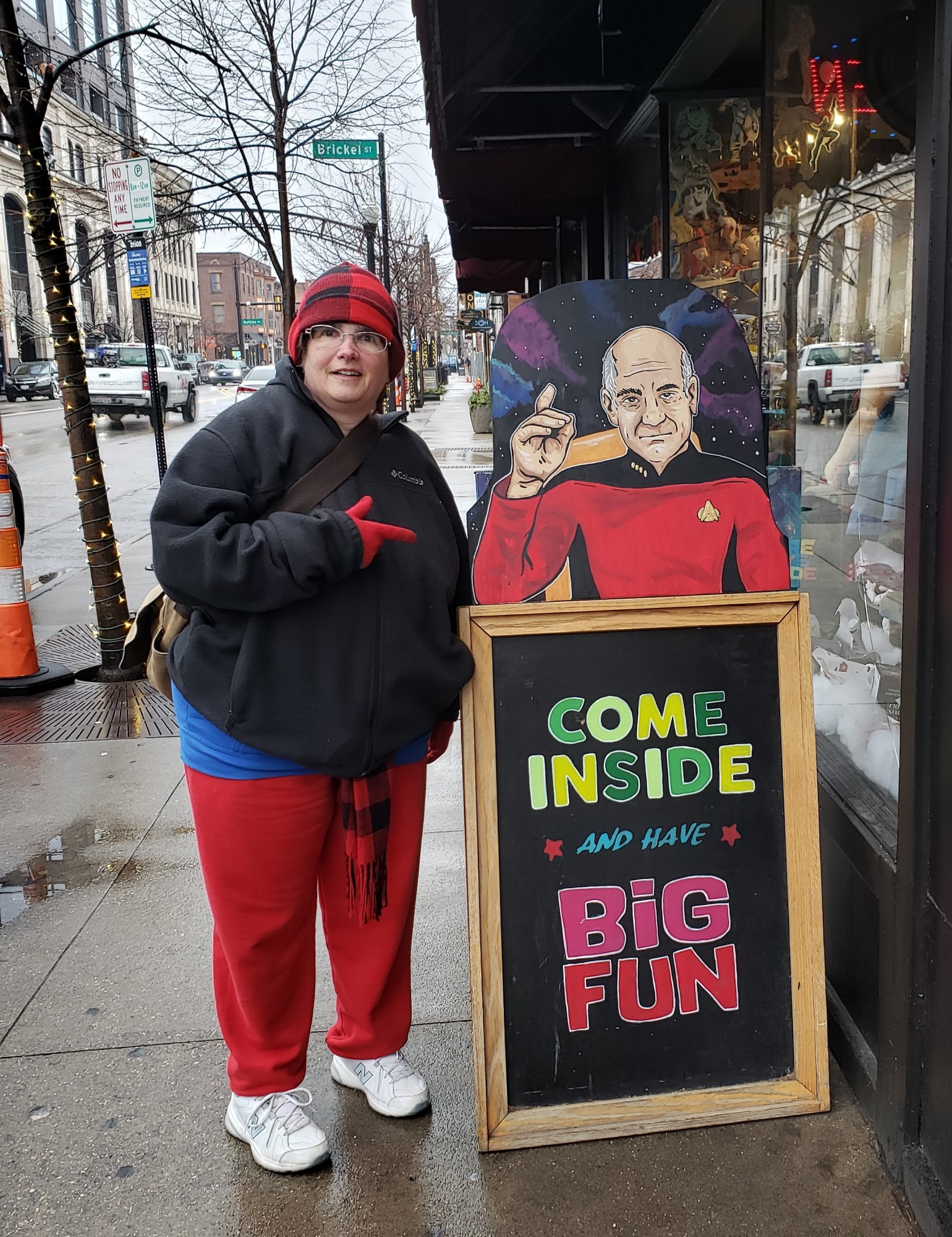 Anne outside in the cold, pointing an outdoor chalkboard reading "Come inside and have Big Fun". Atop the sign, a hand-drawn Captain Picard is about to make his classic "Engage!" hand signal.