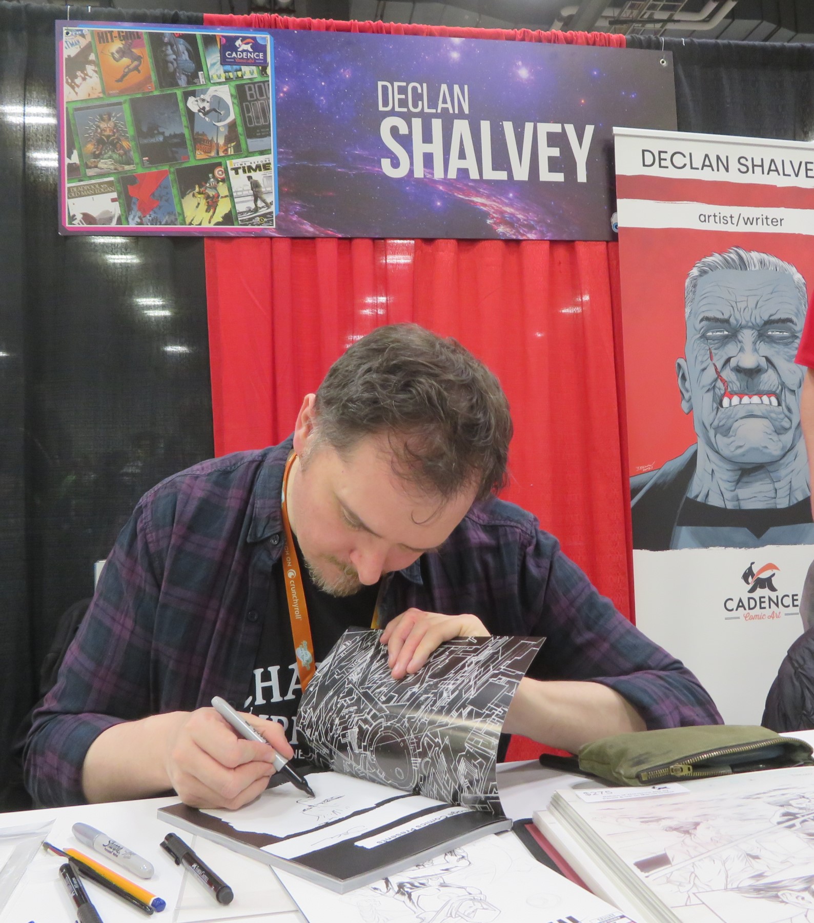Declan Shalvey at his table, sketching in the front page of a graphic novel. His name is on a large card mounted above red curtains behind him. A standee at right promotes his Image series "Old Dog".