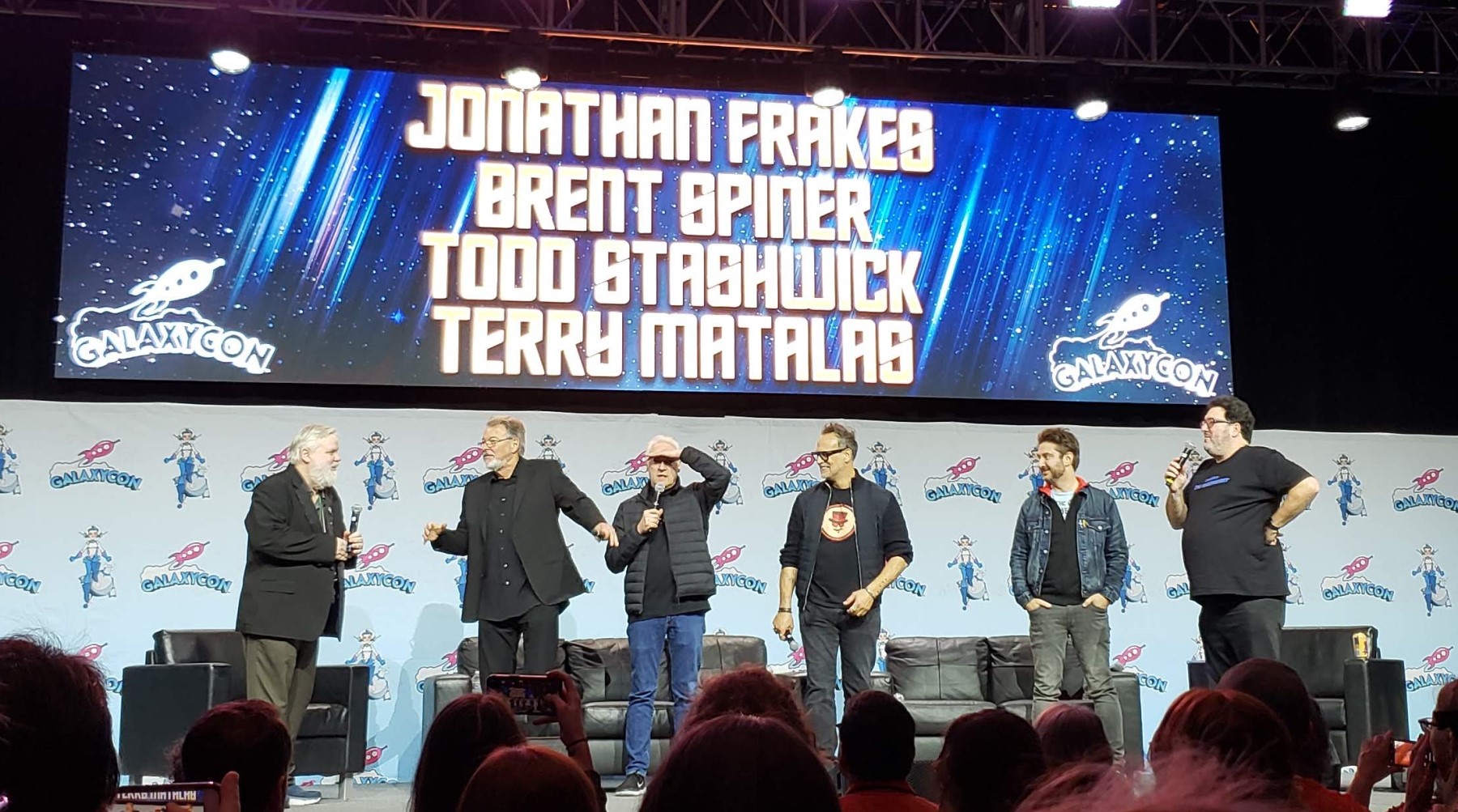 A few minutes before showtime, actor/director Jonathan Frakes took the stage and began to sing “Volaré”. A few in the audience joined in, only for him to cut it short. (We got his autograph at Wizard World Chicago 2014 and jazz hands at Louisville Supercon 2018, a GalaxyCon ancestor.) Soon he was joined by Brent Spiner (a pre-MCC Wizard World Chicago, Indiana Comic Con 2022, and Cincinnati Comic Expo three months ago); season-3 MVP Todd Stashwick (Fan Expo Chicago five months ago), and showrunner Terry Matalas (the day before).