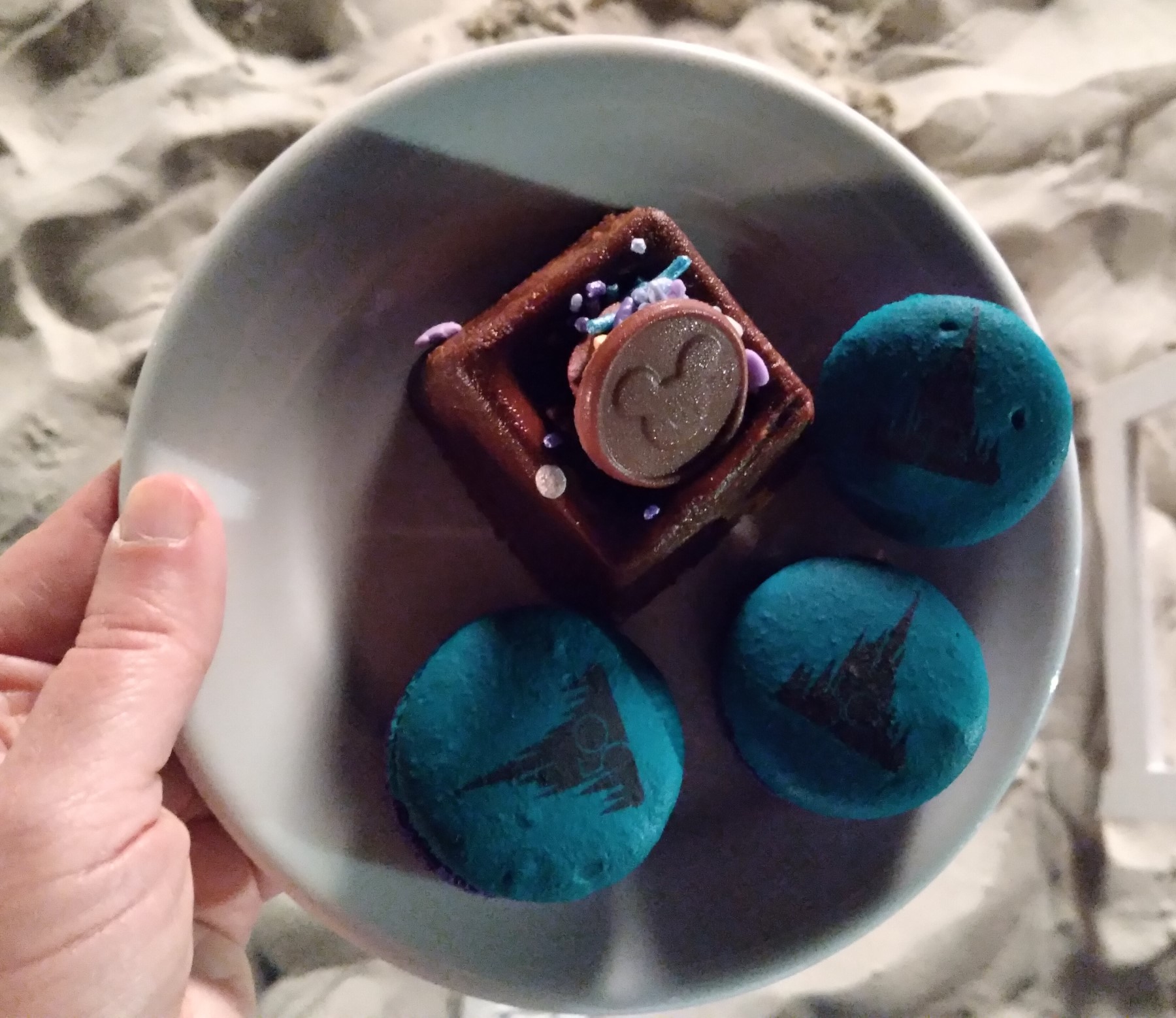 For dessert, Magic Kingdom blueberry macarons and a flourless chocolate torte with chocolate Mickey head coin.