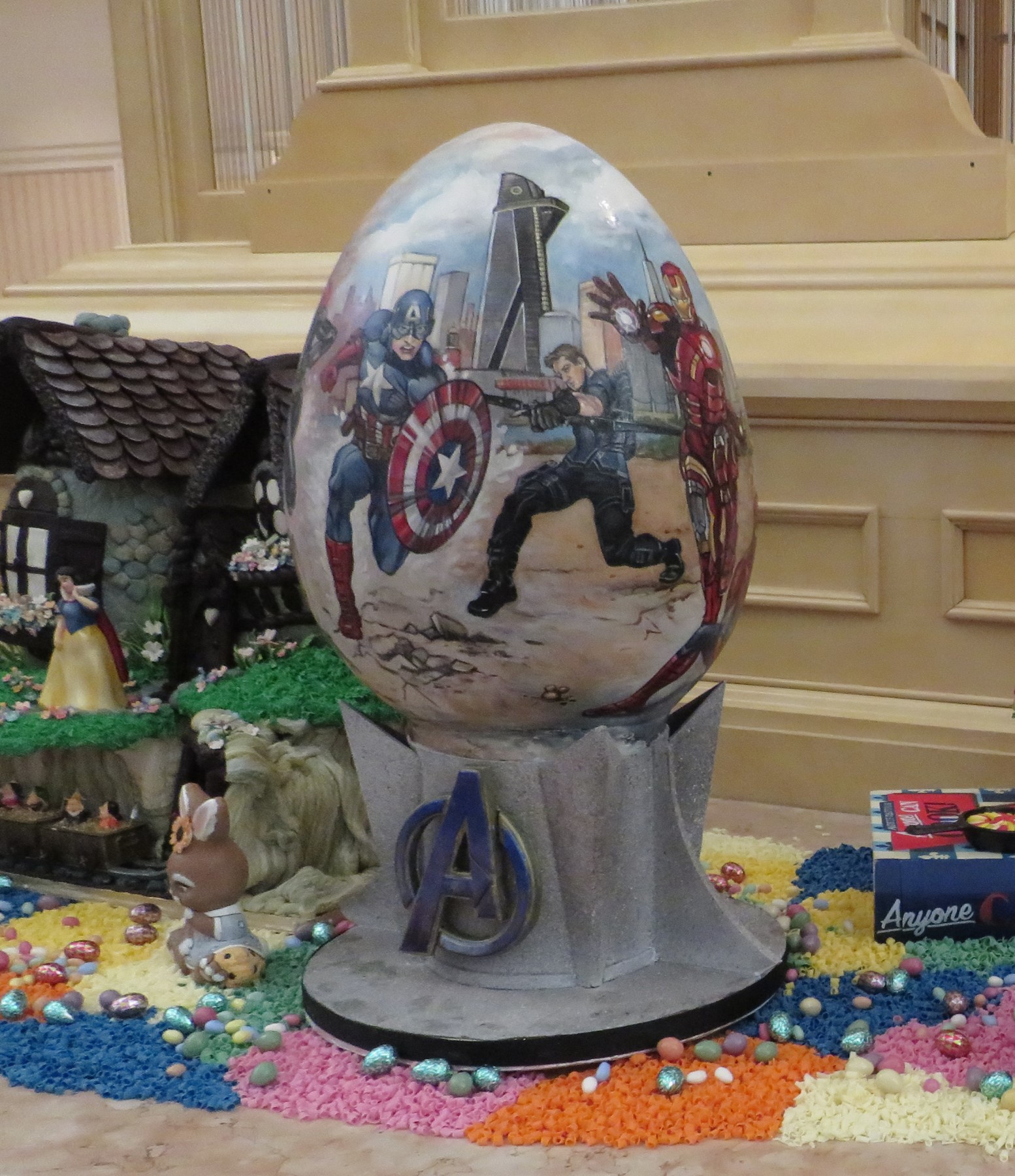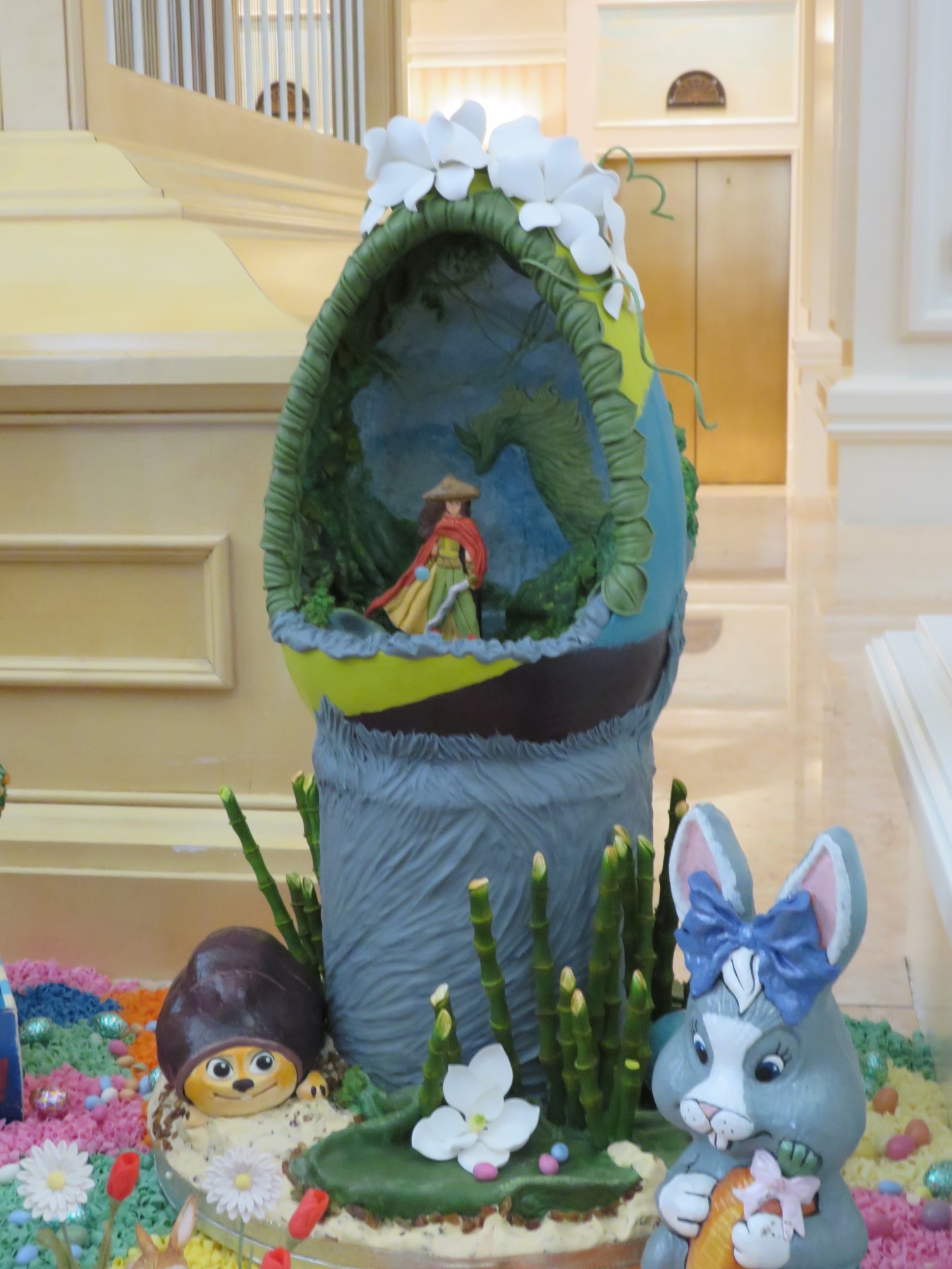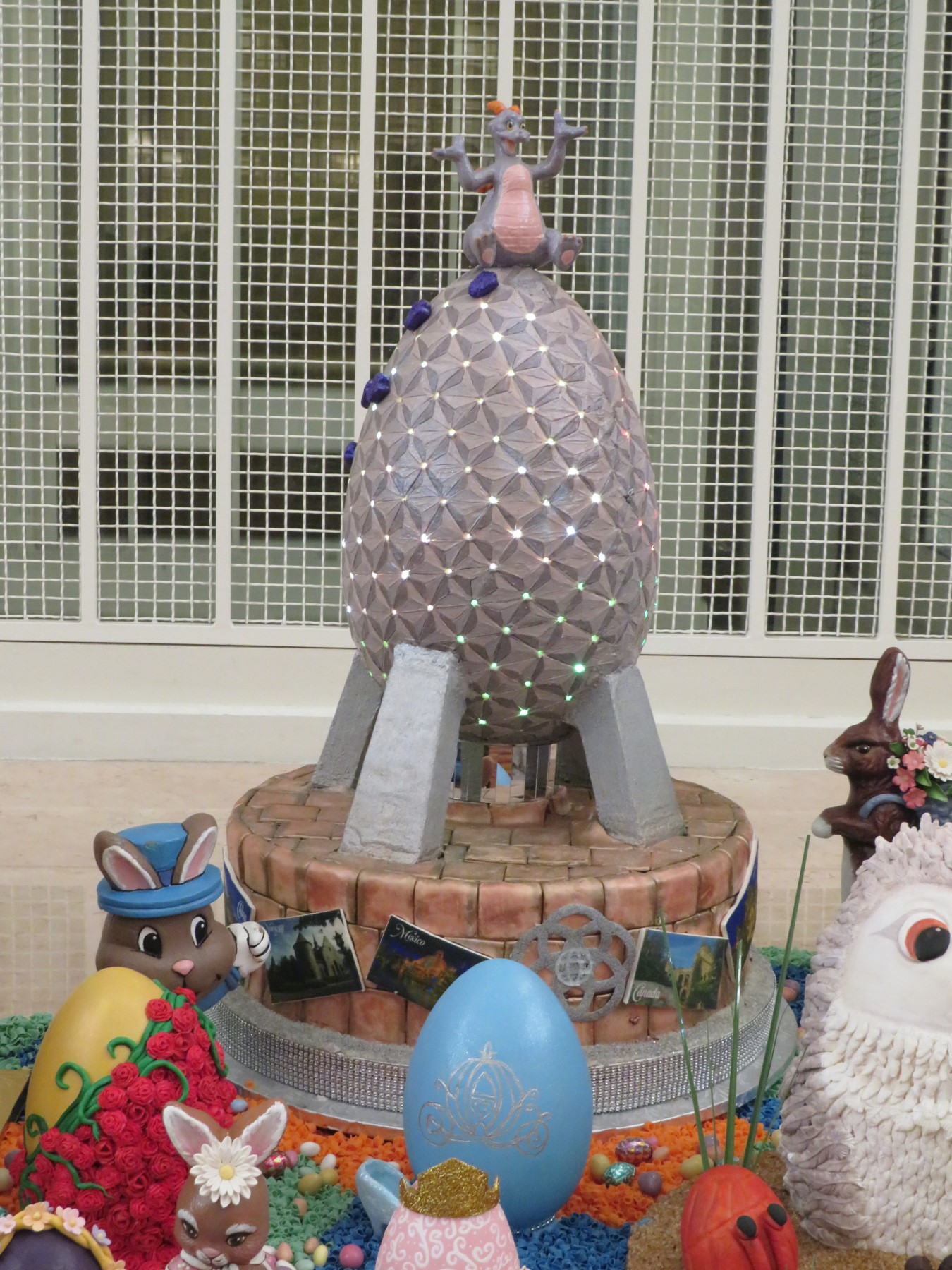 During the late afternoon of my one-man tour through the Grand Floridian grounds and around the Disney Resorts’ monorail track, in their main lobby I came across what’s apparently an annual Easter feature in their Main Building: an exhibit of egg-shaped sculptures honoring their companies’ films and theme park rides. Some weren’t egg-shaped, instead containing egg motifs. Some were new for 2023; some were holdovers from the past. A few were works-in-progress. All were a gentle admonishment to myself that, yes, I’m sharing these pics well outside the Easter 2023 season when we took them, but in plenty of time for Easter 2024, skipping right over Valentine’s Day and getting ahead of Hallmark for once.