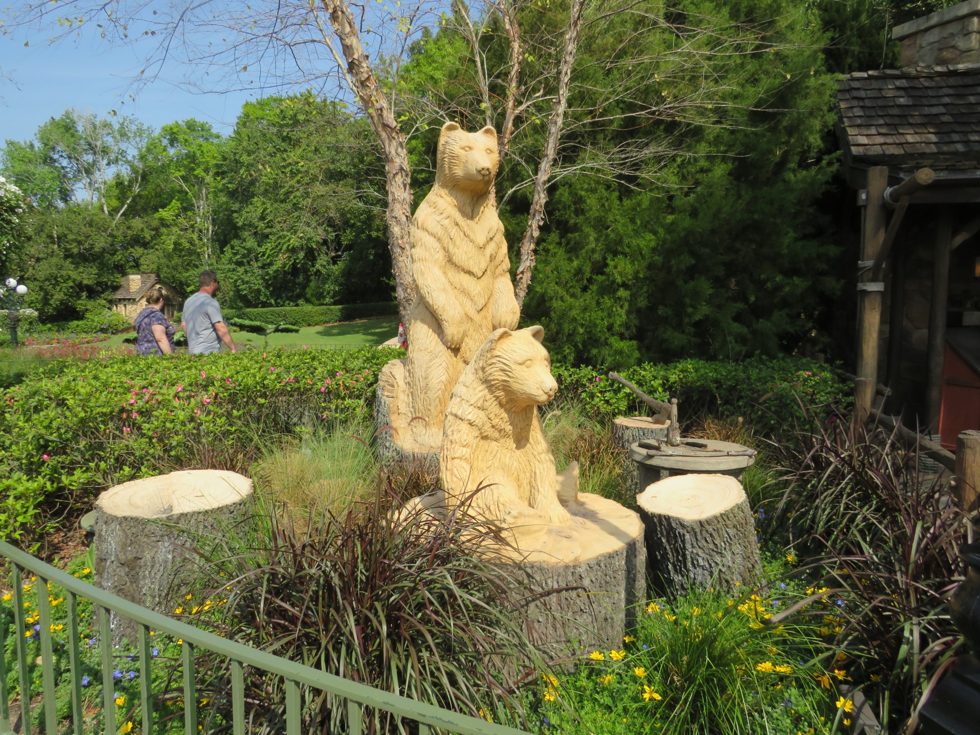 Two large bears carved from trees, mostly completed. One sits, one stands behind it. Stumps surround them, one with an ax in it. Two guests walk in the background.