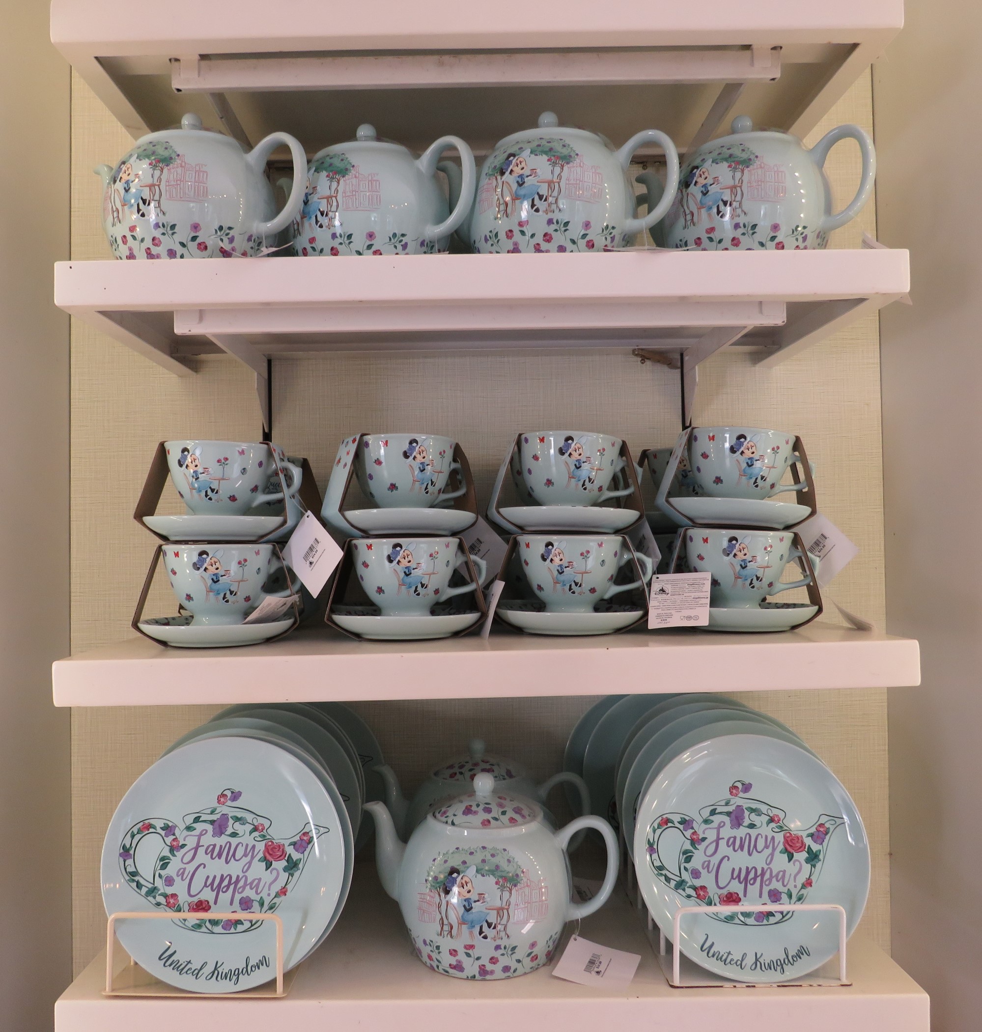Souvenir shop shelves selling pink and white "Fancy a Cuppa" brand tea cups, saucers, and kettles with Minnie Mouse on them.