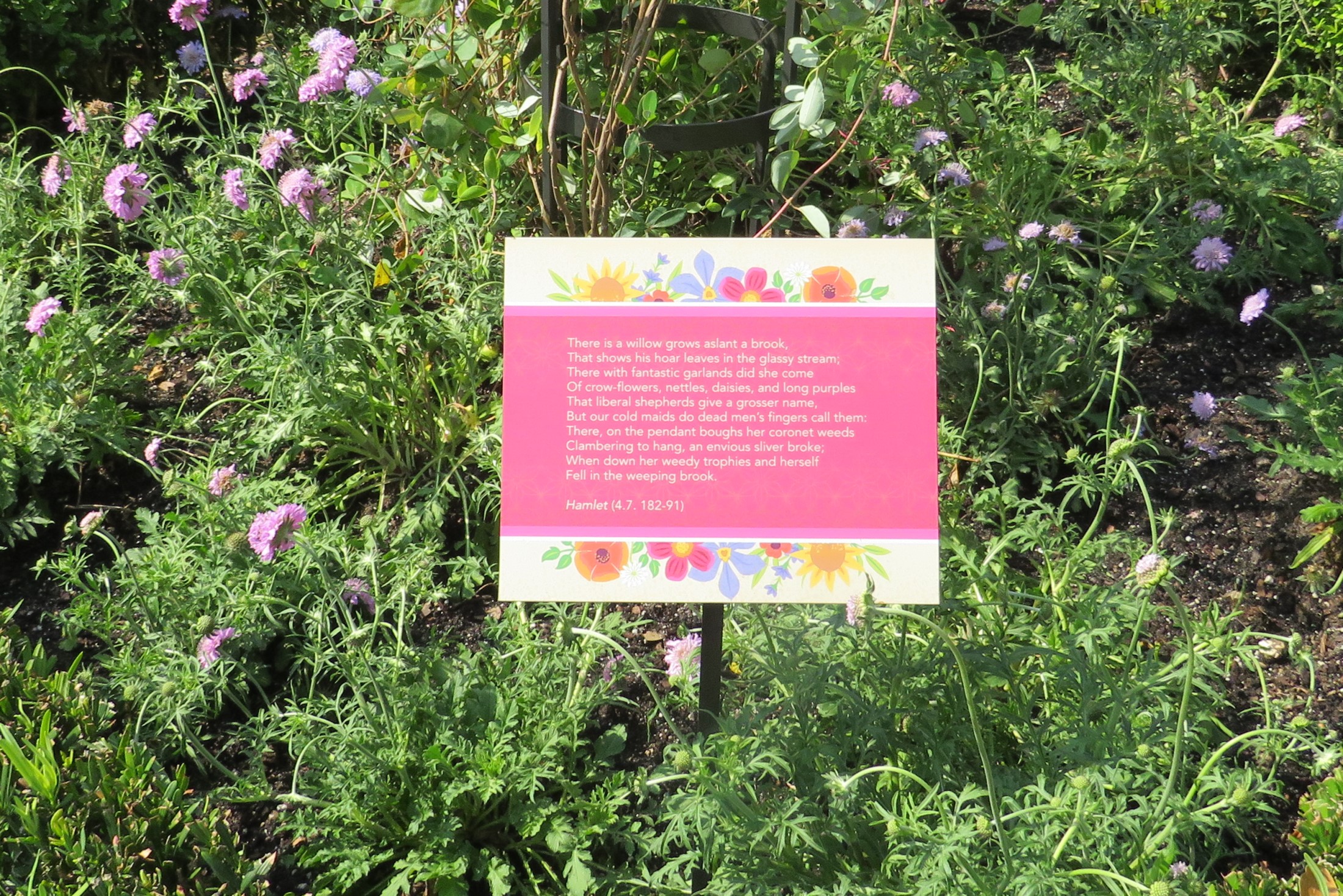 A garden with a large sign amid the purple flowers, quoting "Hamlet" Act 4, Scene 7, lines 182-191.