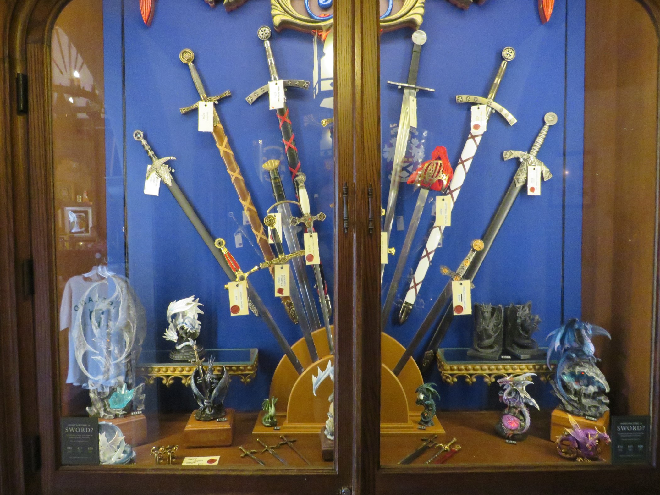 A display case with seven swords hung in a half-circle, dragon knickknacks, and decorative knives.