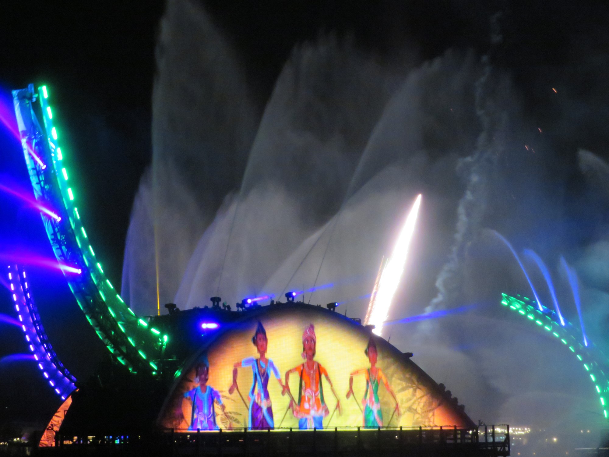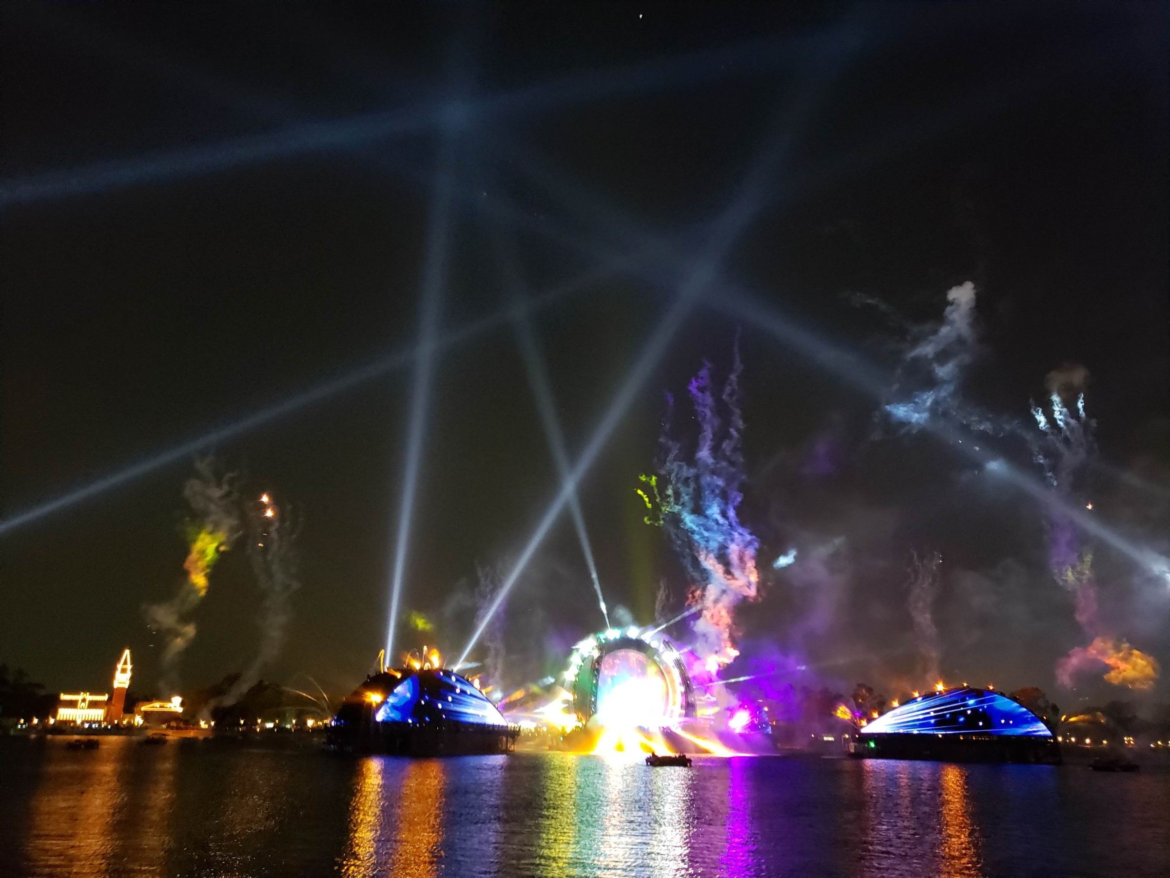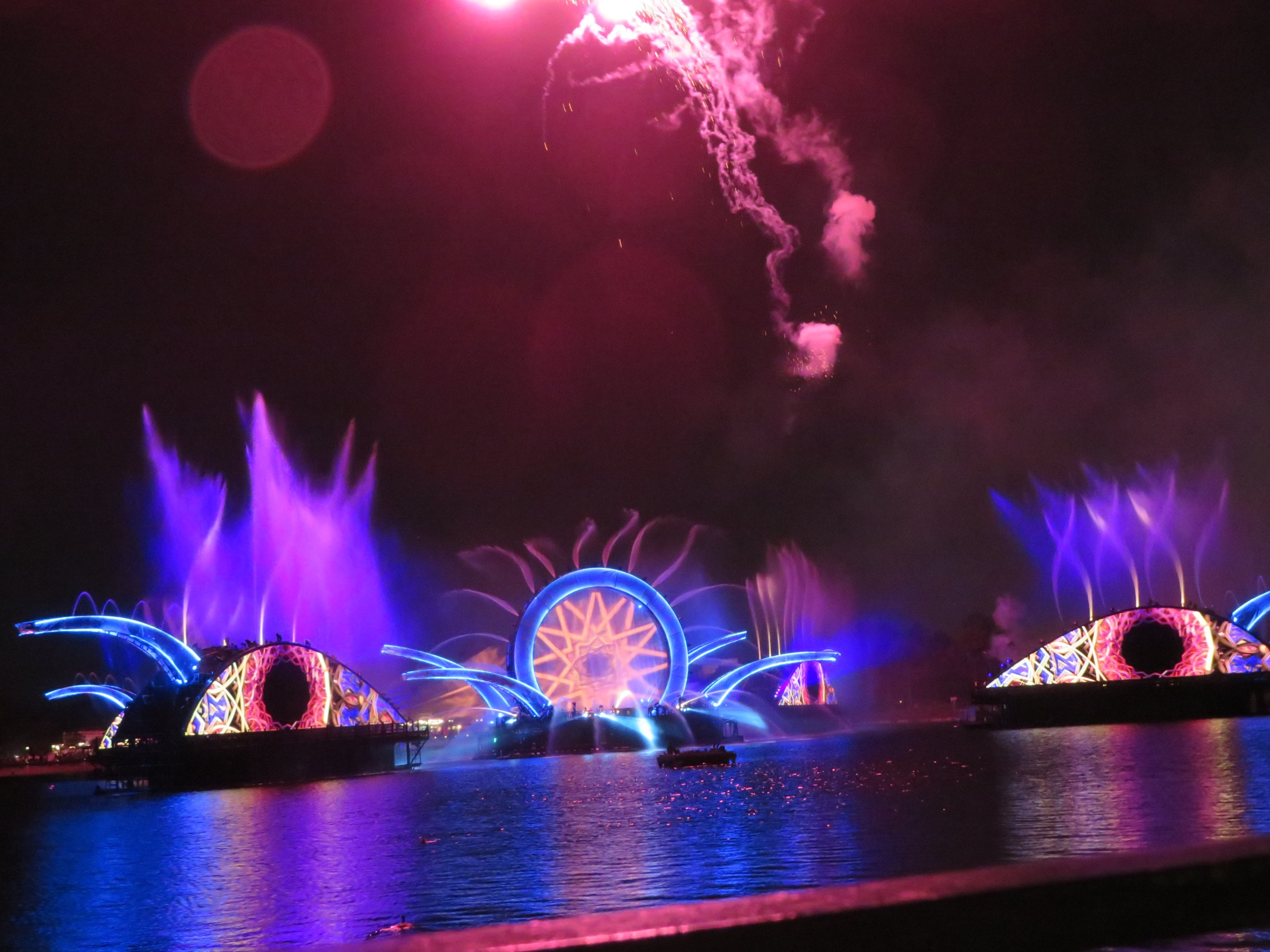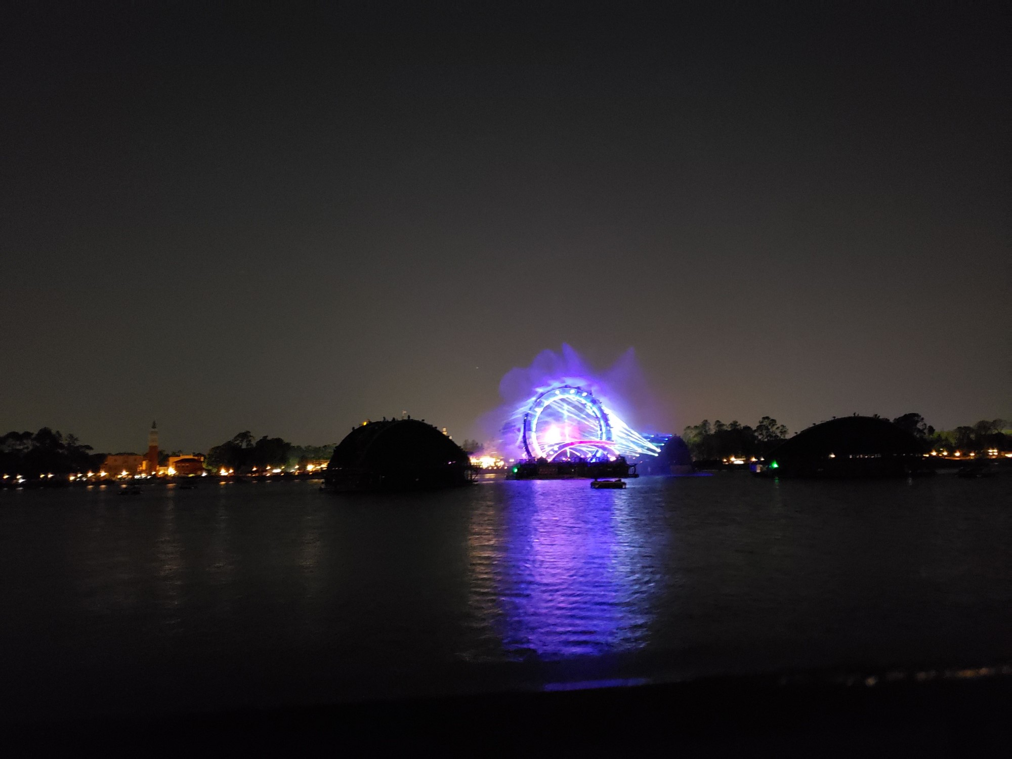 Before we recount what happened with the company dinner at EPCOT, it’s important and calming for me to focus first on the most breathtaking part of that long Wednesday evening. At 8:30 p.m. all of us guests were ushered from the banquet facility on the park’s west edge to a centralized, gated party space on the north shore of World Showcase Lagoon. Snacks and booze were offered while we were treated to the 9:00 showing of the park’s resident closing-time light show, a 30-minute program called Harmonious. A synchronized, beauteous onslaught of fireworks, fountains, spotlights, kaleidoscopic effects, oddly shaped screens on floating platforms, songs familiar and unfamiliar, and a barely discernible narrative. It’s all you could want from the end of an amusement-park day and more.