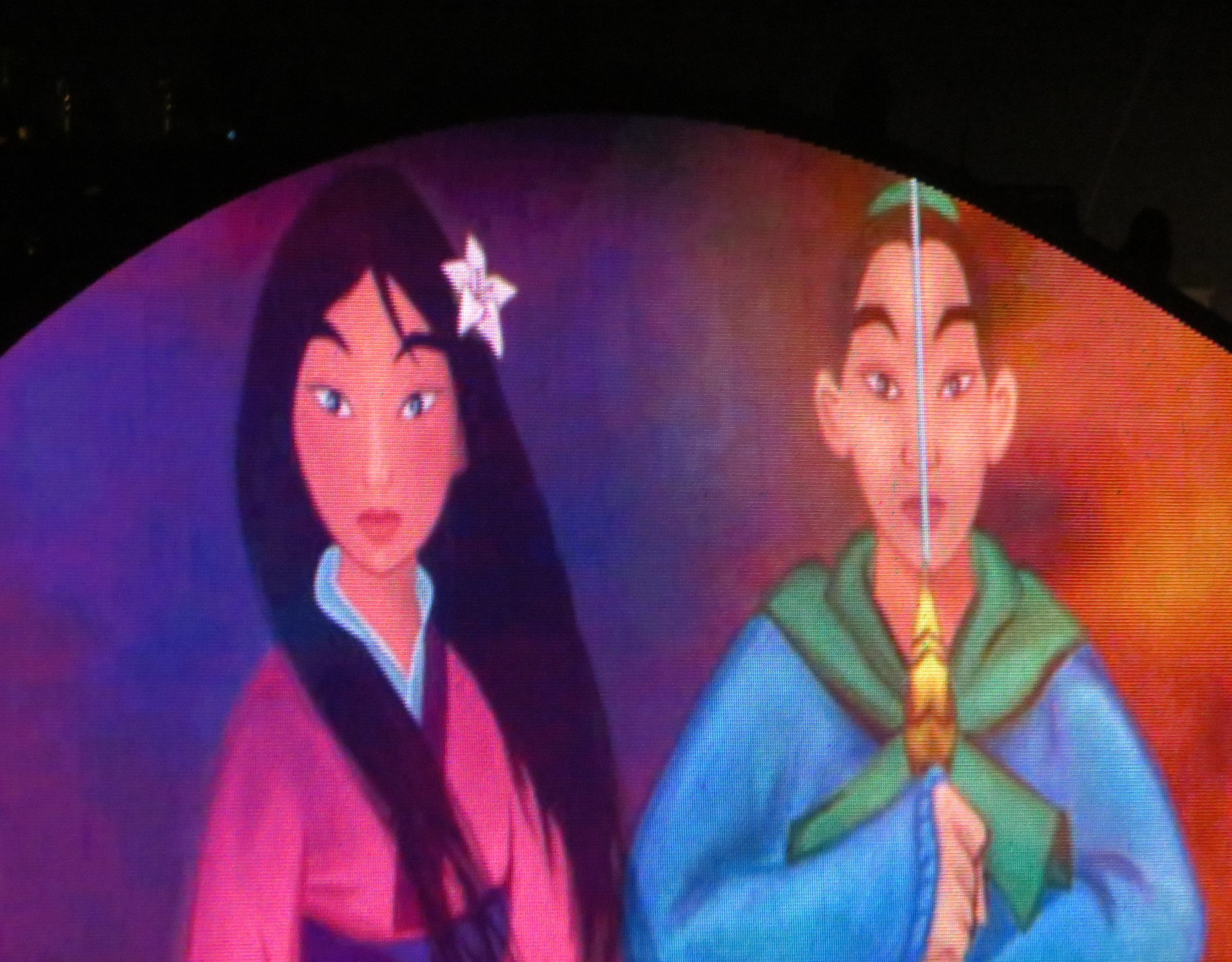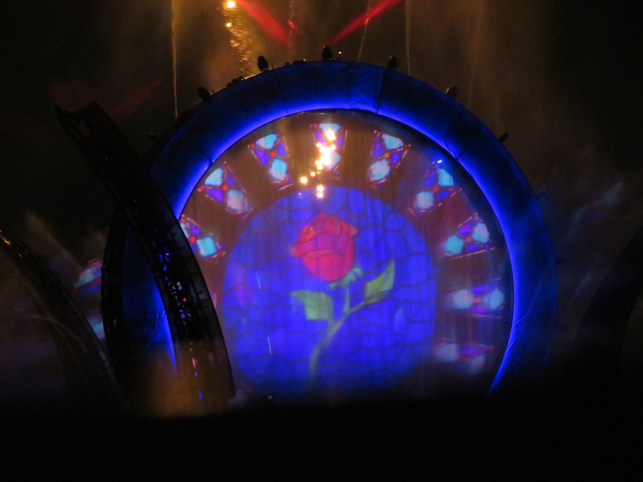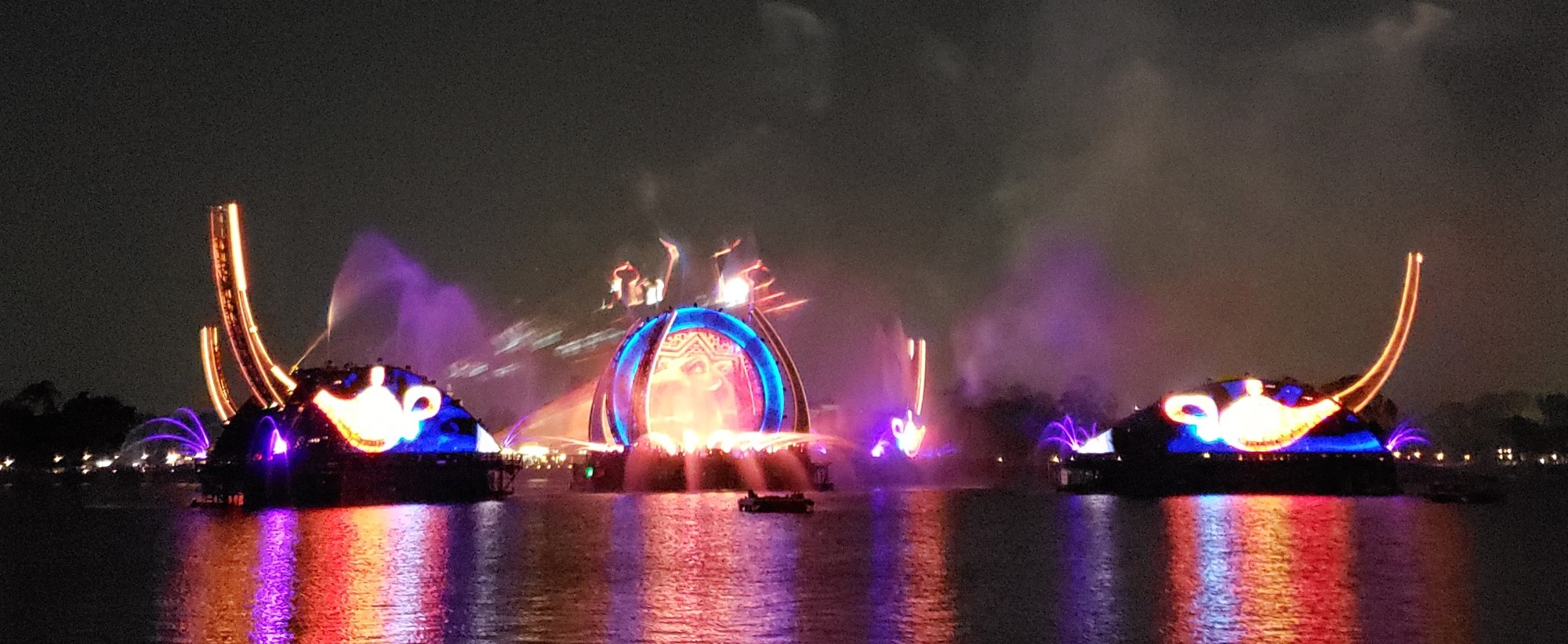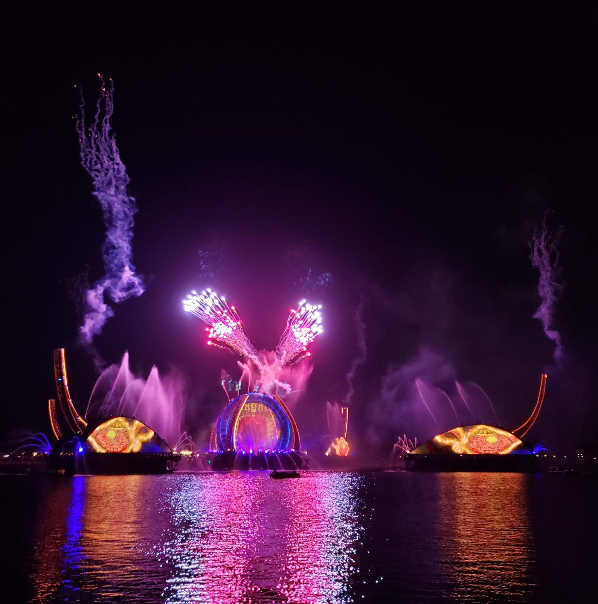 Before we recount what happened with the company dinner at EPCOT, it’s important and calming for me to focus first on the most breathtaking part of that long Wednesday evening. At 8:30 p.m. all of us guests were ushered from the banquet facility on the park’s west edge to a centralized, gated party space on the north shore of World Showcase Lagoon. Snacks and booze were offered while we were treated to the 9:00 showing of the park’s resident closing-time light show, a 30-minute program called Harmonious. A synchronized, beauteous onslaught of fireworks, fountains, spotlights, kaleidoscopic effects, oddly shaped screens on floating platforms, songs familiar and unfamiliar, and a barely discernible narrative. It’s all you could want from the end of an amusement-park day and more.