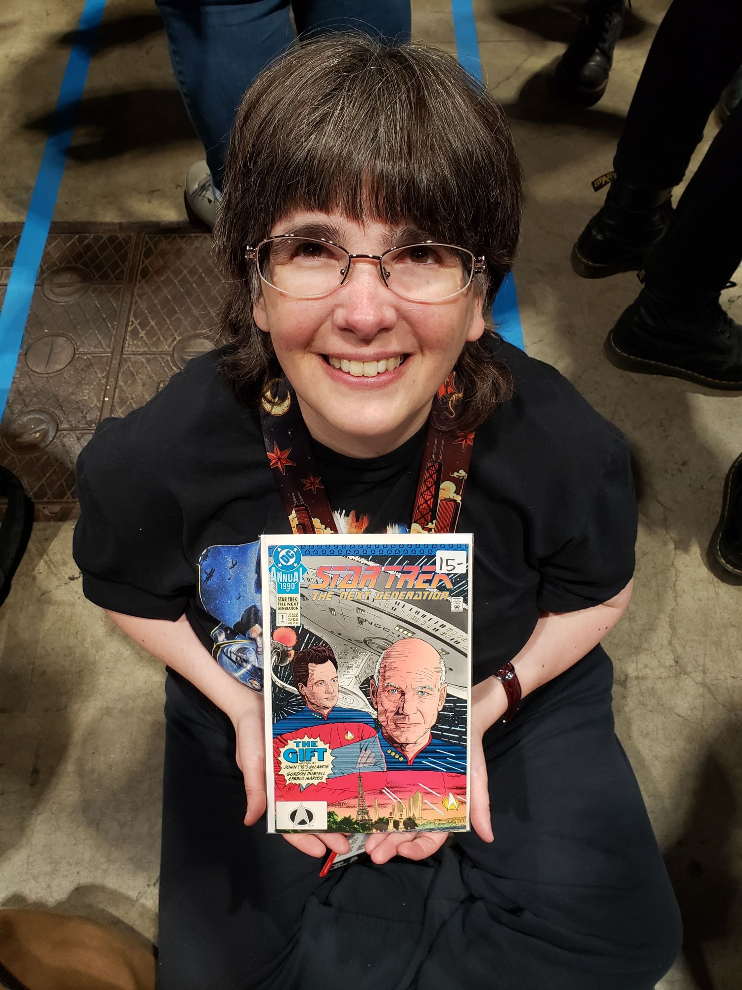 Incredibly, Anne found the one back issue she wanted: an old DC Star Trek: The Next Generation Annual written by John de Lancie, a.k.a. Q himself.