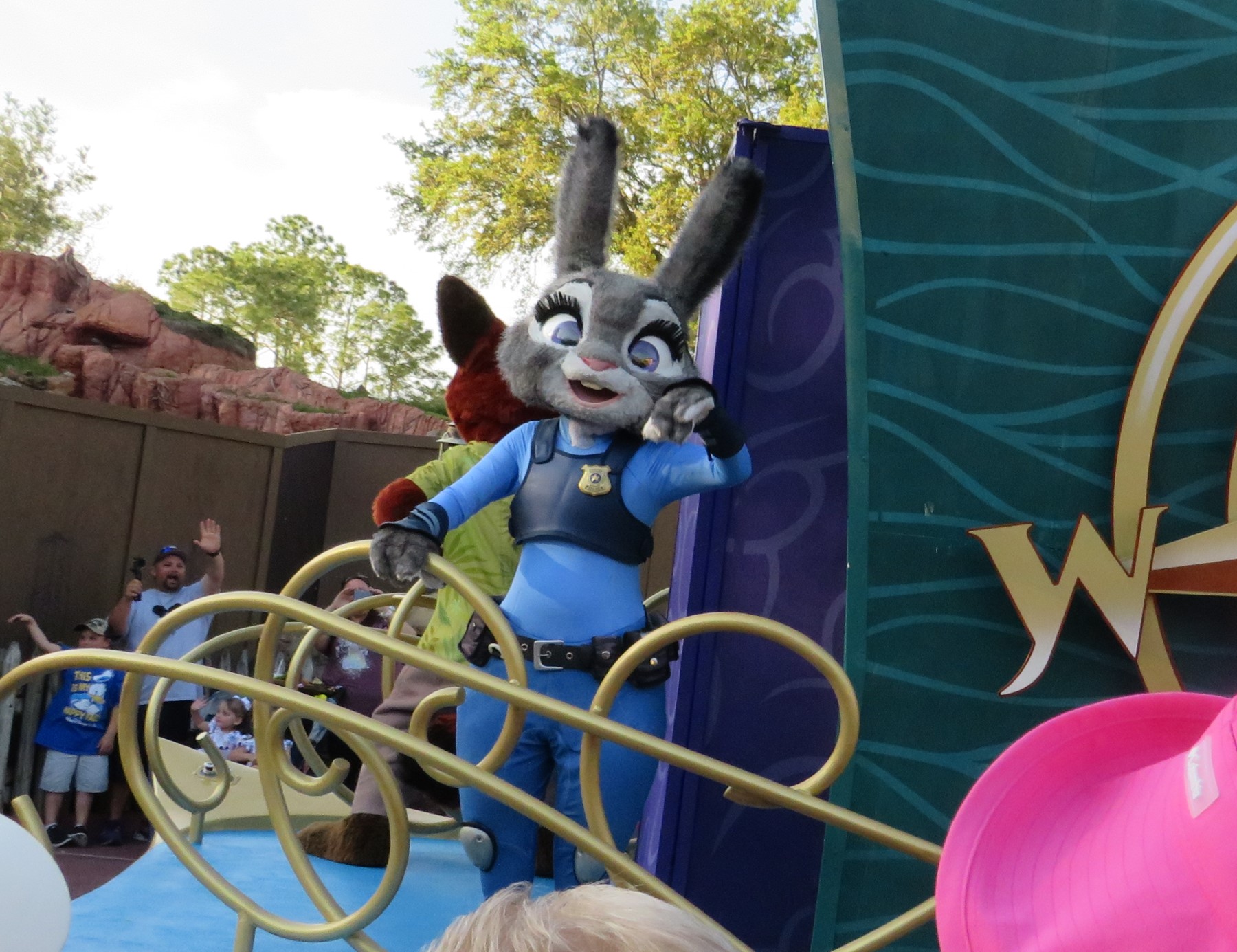 Case in point: the Disney Adventure Friends Cavalcade! There we were, wandering toward the northern border of Frontierland when we ran into a newly formed roadblock, which made way for a slew of Disney characters to emerge from a gate on our left. An even mix of popular favorites and deep-dive obscurities merrily danced, pranced, strolled, fed upon adulation, and maybe taught us a lesson that sometimes there are good reasons to stop traffic.
