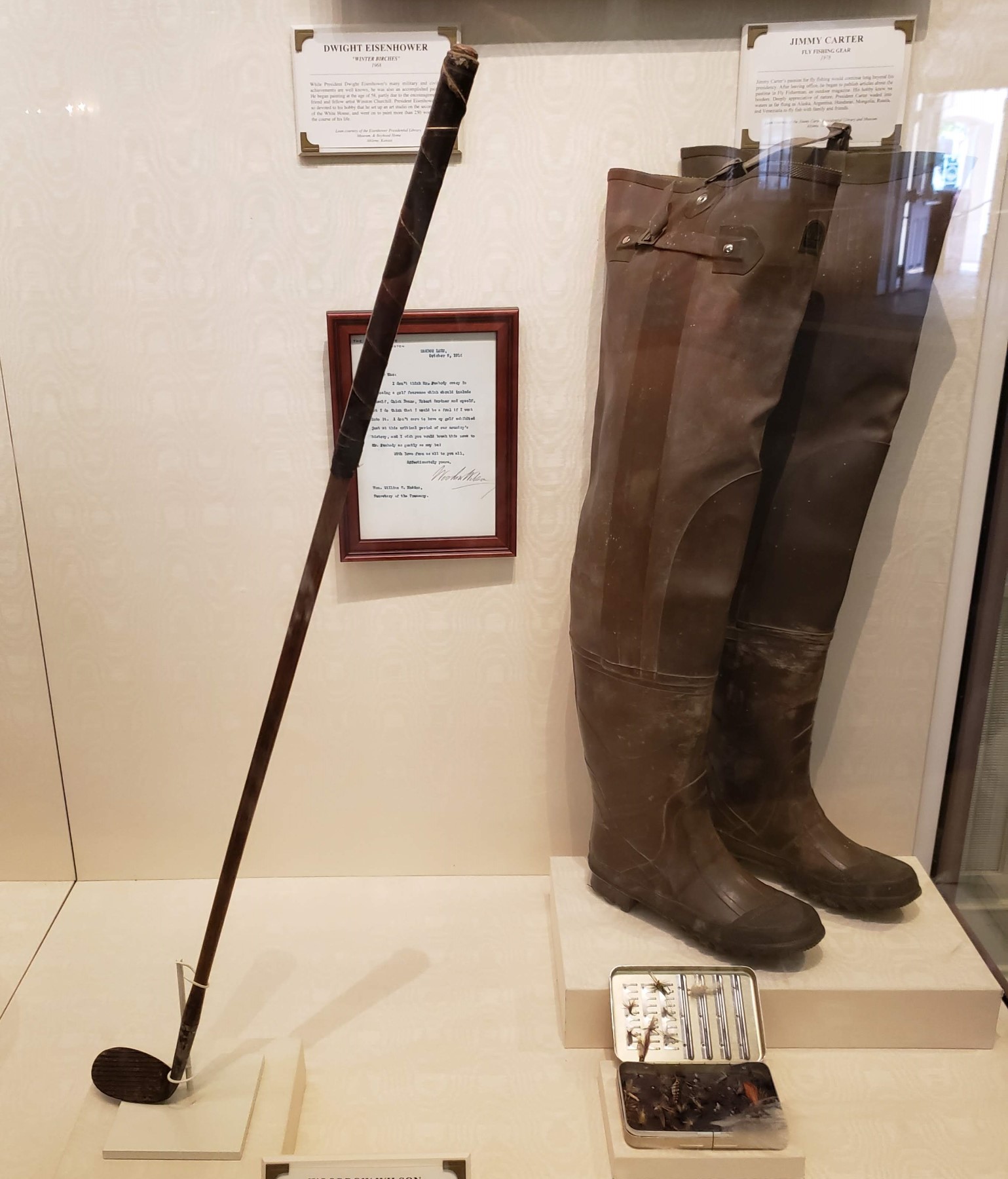 At left, Woodrow Wilson’s golf club and a letter signed by him. At right, Jimmy Carter’s fly-fishing lures and wading boots.