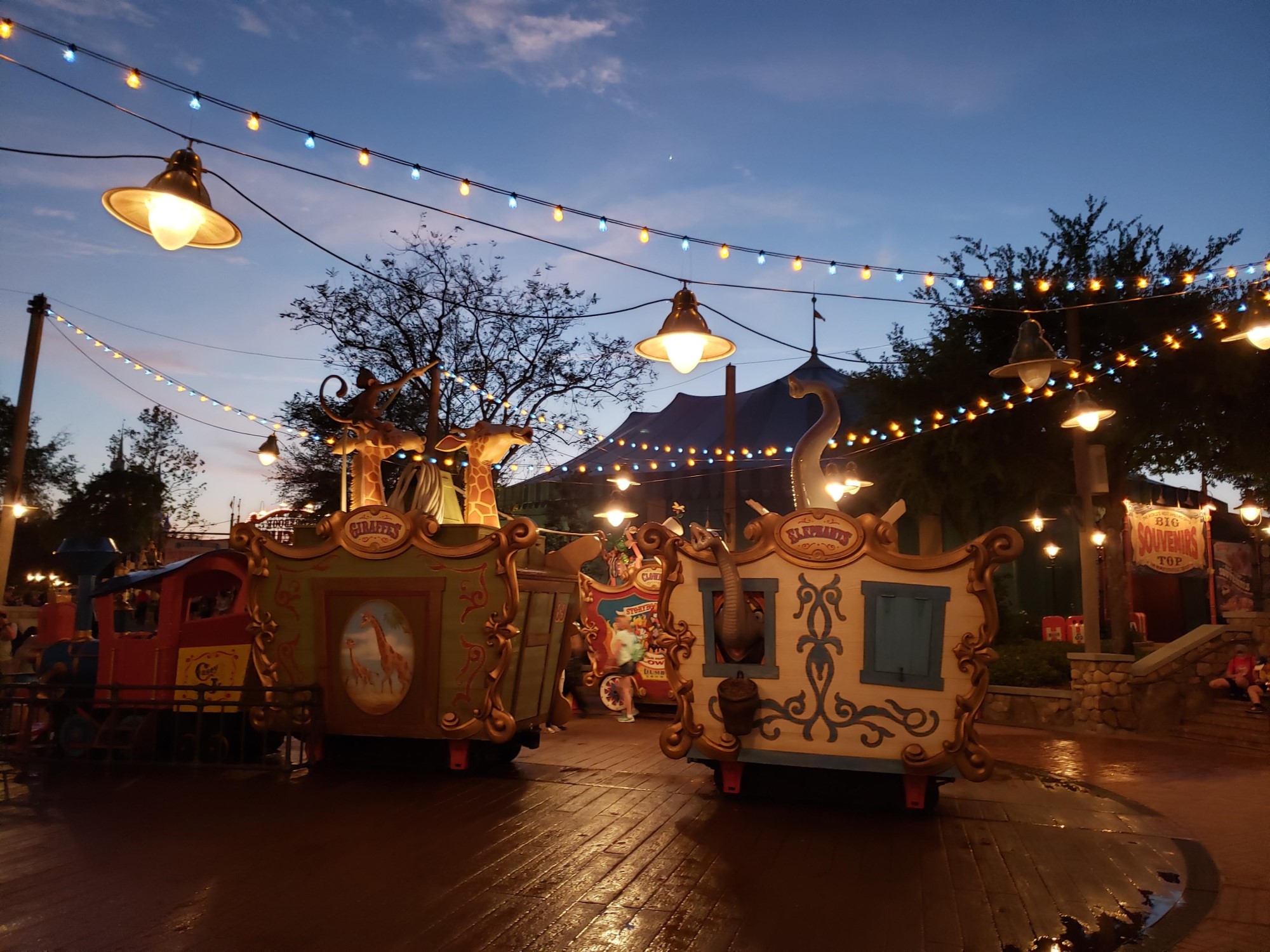 Alas, we ran out of new lands to explore and found ourselves back on Main Street U.S.A. We passed by the dense crowds who’d staked out their spots for watching the evening fireworks show above Cinderella Castle. We’d seen the larger portions of that program on Tuesday night, but didn’t have time to stick around for the holograms and other light-show wonders that we’d missed from across the lagoon. EPCOT’s Harmonious on Wednesday night had pretty much sated our light-show needs anyway.