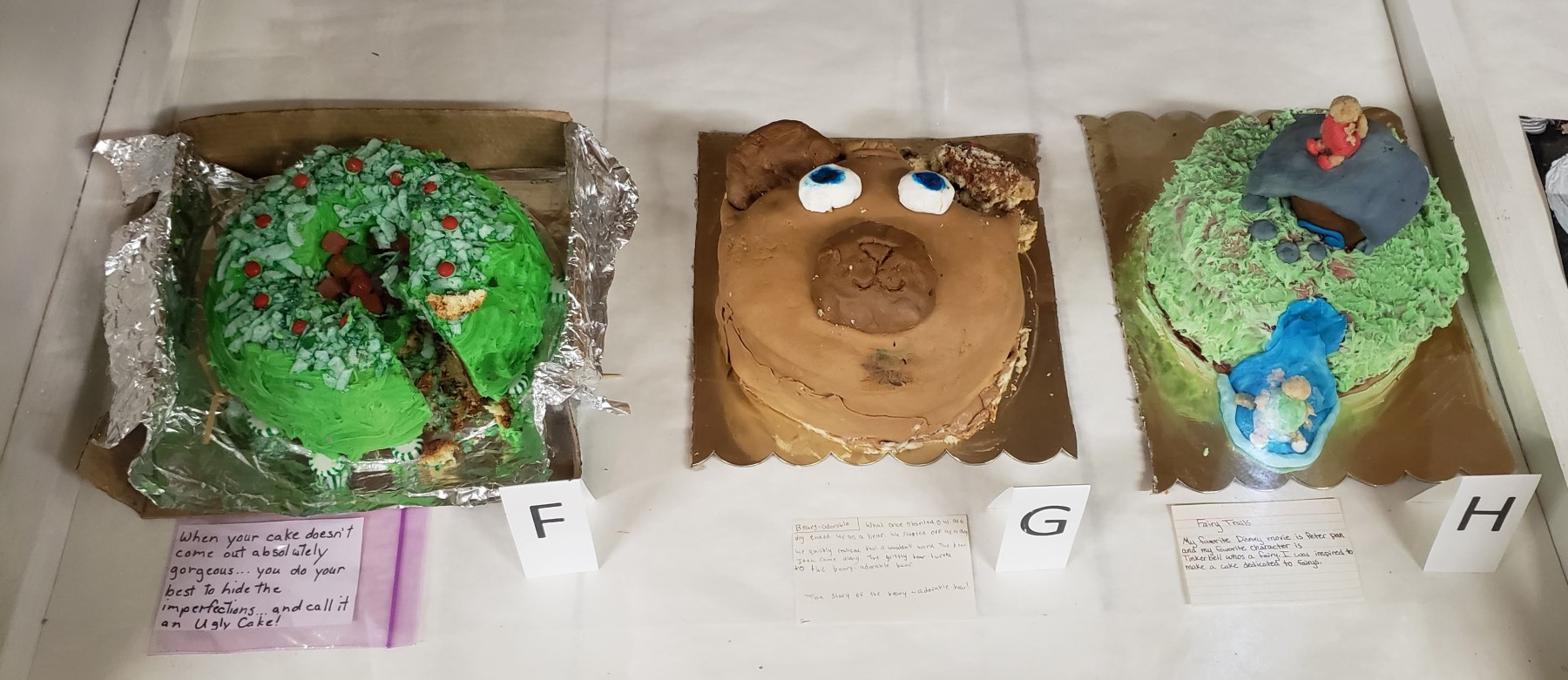 Some entrants in the 4-H Ugly Cake Contest, including a pie, which we overlooked at first but had an explanatory card.