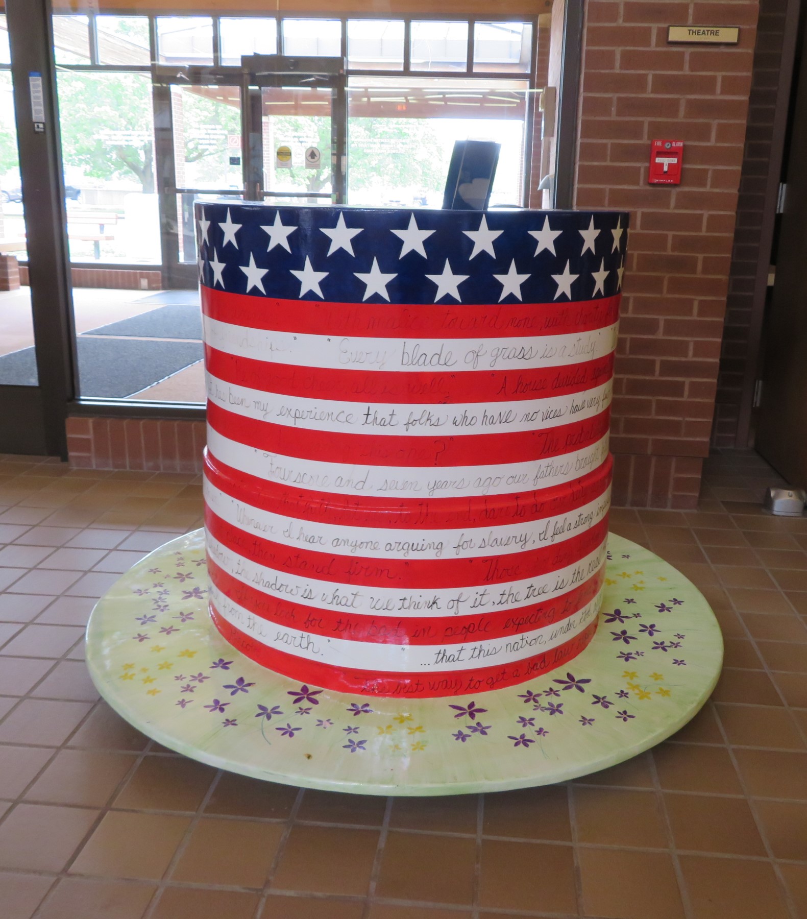 5-foot-tall top hat adorned with red and white stripes. The top row is blue with white stars. Quotes are written in each row in cursive.