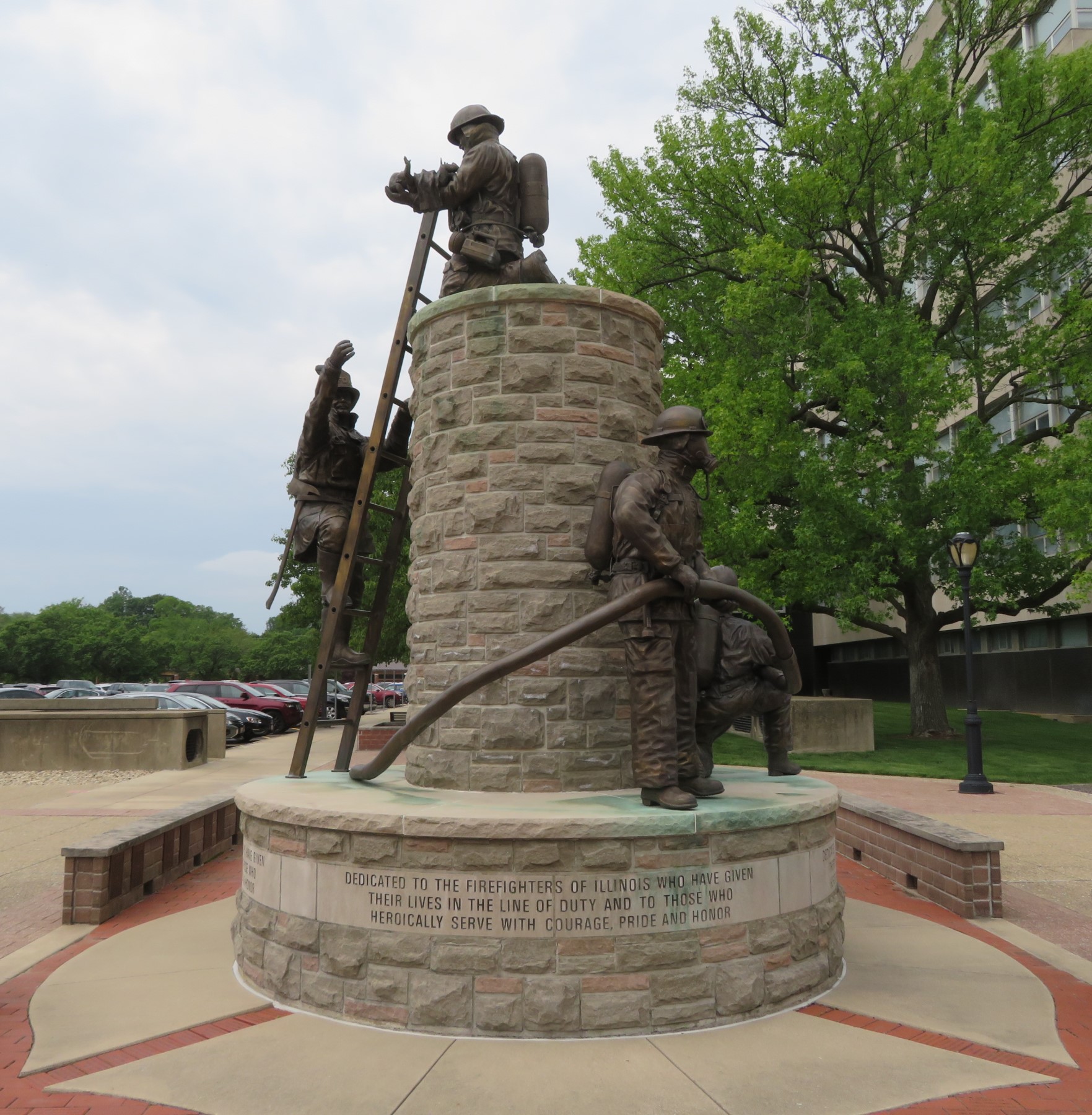 Statue of one male police officer lending a hand and one female officer stopping traffic, standing behind the Illinois State Capitol.