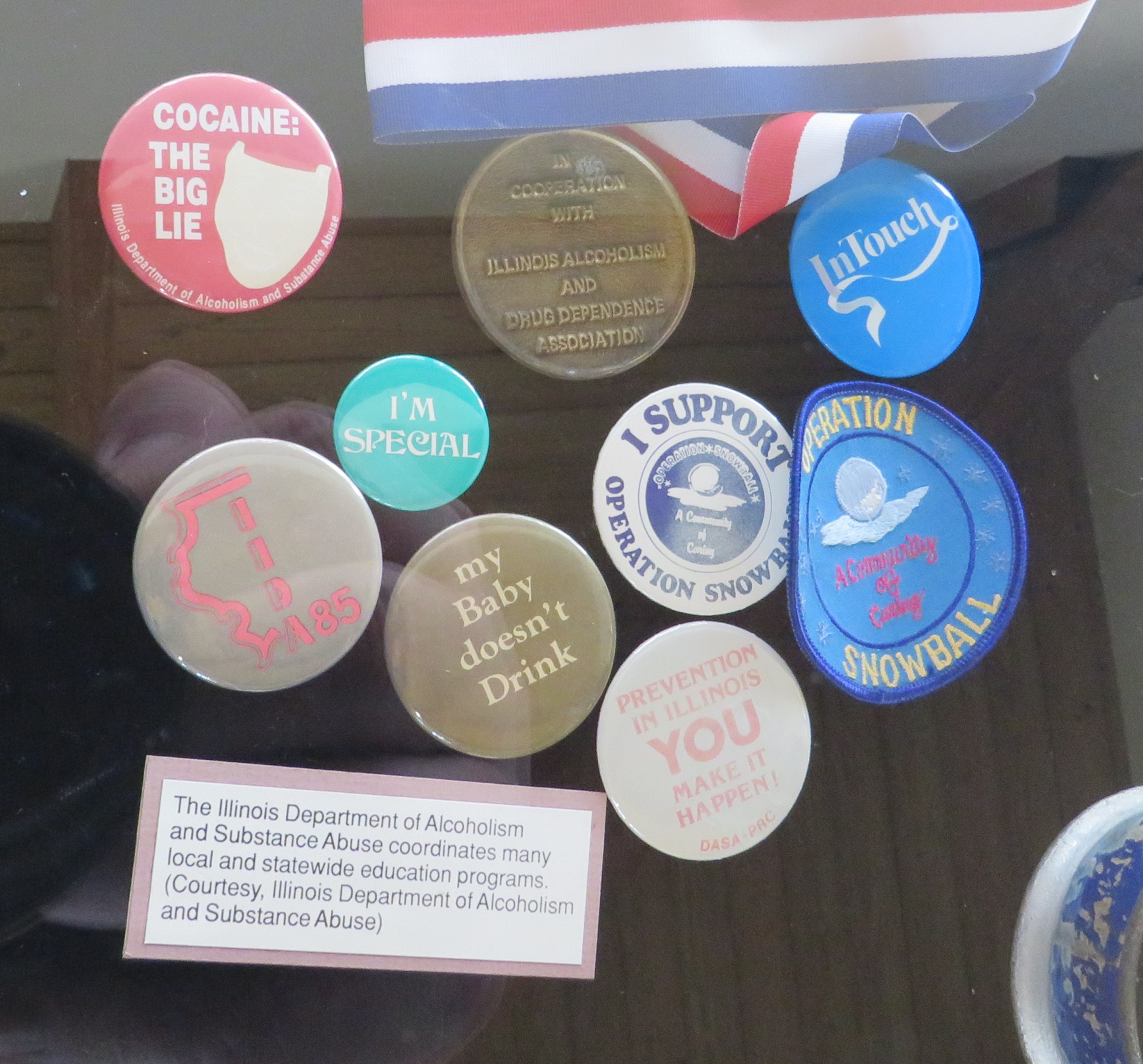 Illinois anti-addiction collectible coins, buttons and patches in a vitrine.