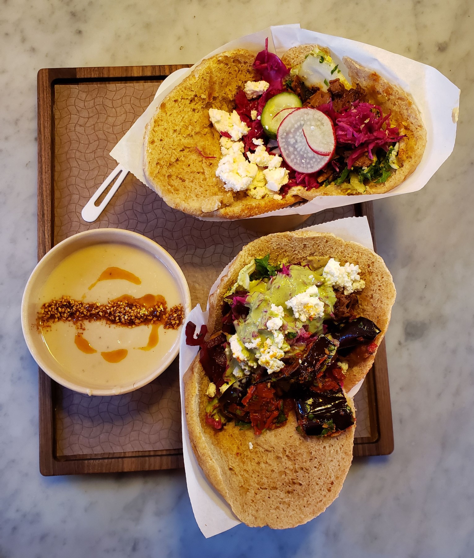 Lunch once again at Brassica, a local fast-casual Mediterranean chain that serves flatbread sandwiches and salads. The soup of the day was cauliflower tahini, my favorite part of the meal.